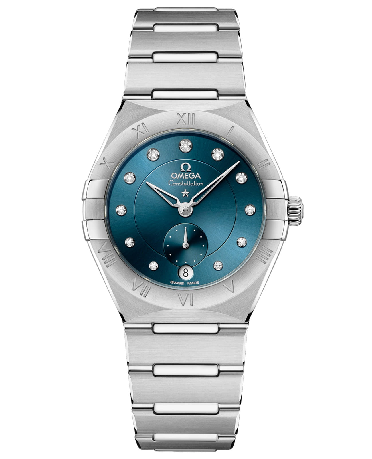 Драматичный и яркий дизайн часов OMEGA Constellation характеризуется знаменитыми гранями полумесяца, а также «скобами» на боковых сторонах корпуса. Эта 34-миллиметровая модель из нержавеющей стали оснащена безелемБезельВнешний ободок, закрепляющий стекло. В спортивных часах так называется поворотное кольцо с делениями на циферблате, выполняет роль таймера – замеряет отрезки времени на шкале. Неподвижный безель – элемент декора. Однонаправленно вращающийся безель на дайверских часах позволяет фиксировать моменты погружения и выныривания на поверхность. с выгравированными римскими цифрами, циферблатом павлиньего синего цвета и круглым окошком даты в положении «6 часов». Инкрементные бриллиантовые часовые индексы представлены в держателях из белого золота 18 карат18-каратное золотоОбозначение по каратной системе пробирования, оно показывает, сколько драгоценного металла содержится в изделии. 18 карат - в составе 75% чистого золота, соответствует 750 пробе.