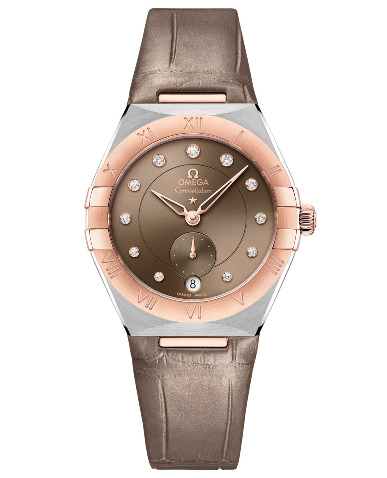 Драматичный и яркий дизайн часов OMEGA Constellation характеризуется знаменитыми гранями полумесяца, а также «скобами» на боковых сторонах корпуса. Модель диаметром 34 мм из золота 18K18-каратное золотоОбозначение по каратной системе пробирования, оно показывает, сколько драгоценного металла содержится в изделии. 18 карат - в составе 75% чистого золота, соответствует 750 пробе.