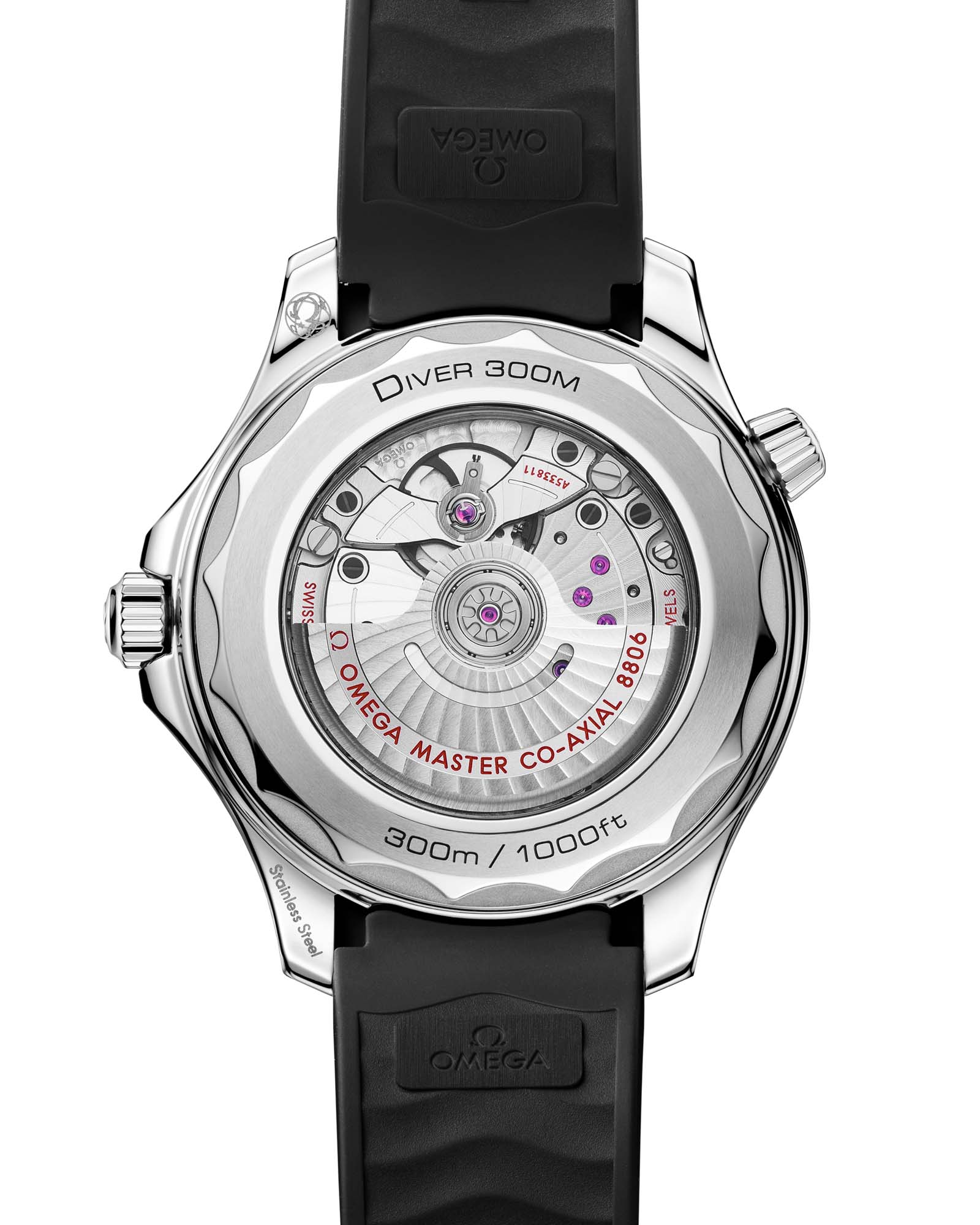 Часы Seamaster Diver 300M, появившиеся в 1993 году, стали настоящей легендой среди ценителей часового искусства. Современная коллекция вобрала в себя знаменитое океанское наследие, привнеся в него самые передовые инновации и дизайнерские решения OMEGA. Модель диаметром 42 мм из нержавеющей стали привлекает внимание черным безелем из оксалатного анодированного алюминия с дайверской шкалой, покрытой белым люминесцентным составом Super-LumiNovaЛюминесцентное покрытиеПозволяет считывать показания времени в темноте. Производители наносят на стрелки, часовые индексы, безель или поверхность циферблата светонакопительный состав, дающий холодное свечение.. Циферблат, также изготовленный из черного алюминия, украшен лазерной гравировкой в виде культового волнообразного узора Diver. Скелетонизированные стрелки и индексы покрыты родием и заполнены белым люминесцентным составом Super-LumiNovaЛюминесцентное покрытиеПозволяет считывать показания времени в темноте. Производители наносят на стрелки, часовые индексы, безель или поверхность циферблата светонакопительный состав, дающий холодное свечение.. Остальные метки, включая логотип OMEGA, выполнены в белом цвете переводным способом. Часы дополнены интегрированным черным каучуковым ремешком с раскладывающейся застежкой и оснащены калибром OMEGA Co-Axial Master Chronometer 8806, который можно рассмотреть сквозь заднюю крышку из сапфирового стеклаСапфировое стеклоПрочный и надёжный материал из кристалла сапфира синтетического происхождения, характеризующийся особой твёрдостью и устойчивостью к царапинам и повреждениям..