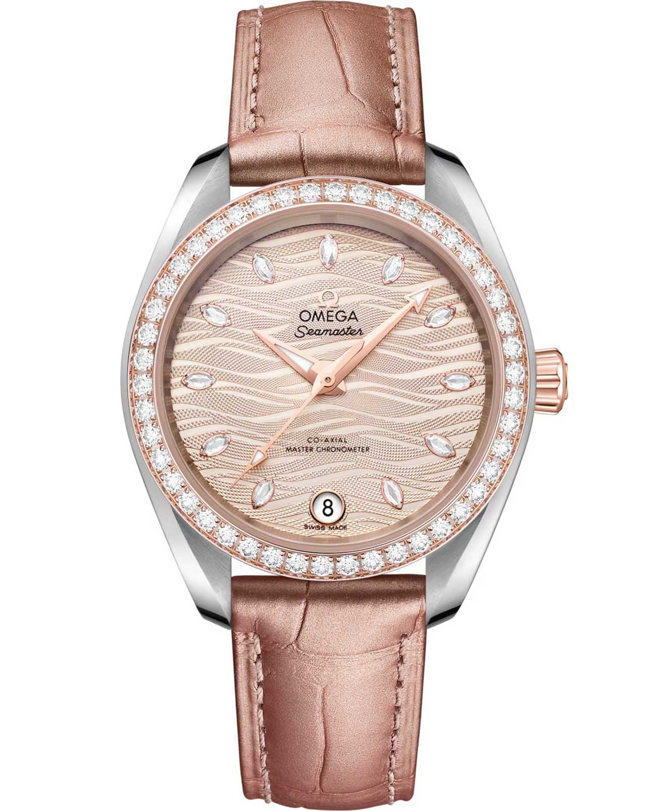 Часы Omega Seamaster Aqua Terra выполнены в симметричном корпусе из нержавеющей стали и 18K Sedna™ золота с завинчивающейся задней крышкой, украшенной волновым узором. Модель дополнена полированным безелем с бриллиантами, что добавляет роскошный акцент. Циферблат золотистого цвета оформлен с использованием волнообразного рисунка и имеет окошко даты на 6 часах. Стрелки выполнены из 18K Sedna™ золота с алмазной полировкой. Часовые метки — 11 бриллиантов в маркизной оправе, что подчёркивает элегантность модели. Калибр Omega 8800 сертифицирован как Master Chronometer — гарантия высочайшей точности и устойчивости к магнитным полям. Запас хода составляет 55 часов. Защиту циферблата обеспечивает сапфировое стеклоСапфировое стеклоПрочный и надёжный материал из кристалла сапфира синтетического происхождения, характеризующийся особой твёрдостью и устойчивостью к царапинам и повреждениям. с антибликовым покрытиемАнтибликовое покрытиеСлой оксида металла в 0,13-0,3 микрон, благодаря которому стекло часов не бликует и не отражает свет. Антибликовое покрытие уменьшает отражение света в 10 раз, обеспечивая отличную читаемость показателей циферблата. с обеих сторон. Водозащита позволяет использовать часы в воде без риска повреждения. Часы установлены на кожаный ремешок бежевого цвета. Это сочетание премиального качества, технологичности и классического дизайна.