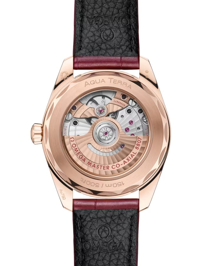 Omega Seamaster Aqua Terra выполнены в симметричном корпусе из 18K Sedna™ золота с завинчивающейся задней крышкой, украшенной волновым узором. Безель инкрустирован бриллиантами, что добавляет модели роскошный акцент. Циферблат дополнен окошком даты и оформлен уникальным волновым рисунком, созданным методом wire bonding — технологией, используемой в микроэлектронике. Циферблат имеет основу из 18K золота и покрыт PVD для стойкости цвета. Часовые метки представлены рубинами, а стрелки выполнены из 18K Sedna™ золота и оснащены люминесцентным покрытиемЛюминесцентное покрытиеПозволяет считывать показания времени в темноте. Производители наносят на стрелки, часовые индексы, безель или поверхность циферблата светонакопительный состав, дающий холодное свечение. Super-LumiNova для лучшей читаемости в темноте. Калибр Omega 8807 сертифицирован как Master Chronometer — гарантия высочайшей точности и устойчивости к магнитным полям. Запас хода составляет 55 часов. Защиту циферблата обеспечивает сапфировое стеклоСапфировое стеклоПрочный и надёжный материал из кристалла сапфира синтетического происхождения, характеризующийся особой твёрдостью и устойчивостью к царапинам и повреждениям. с антибликовым покрытиемАнтибликовое покрытиеСлой оксида металла в 0,13-0,3 микрон, благодаря которому стекло часов не бликует и не отражает свет. Антибликовое покрытие уменьшает отражение света в 10 раз, обеспечивая отличную читаемость показателей циферблата. с обеих сторон. Водозащита позволяет использовать часы в воде без риска повреждения. Часы установлены на красный кожаный ремешок. Это сочетание премиального качества, технологичности и классического дизайна.