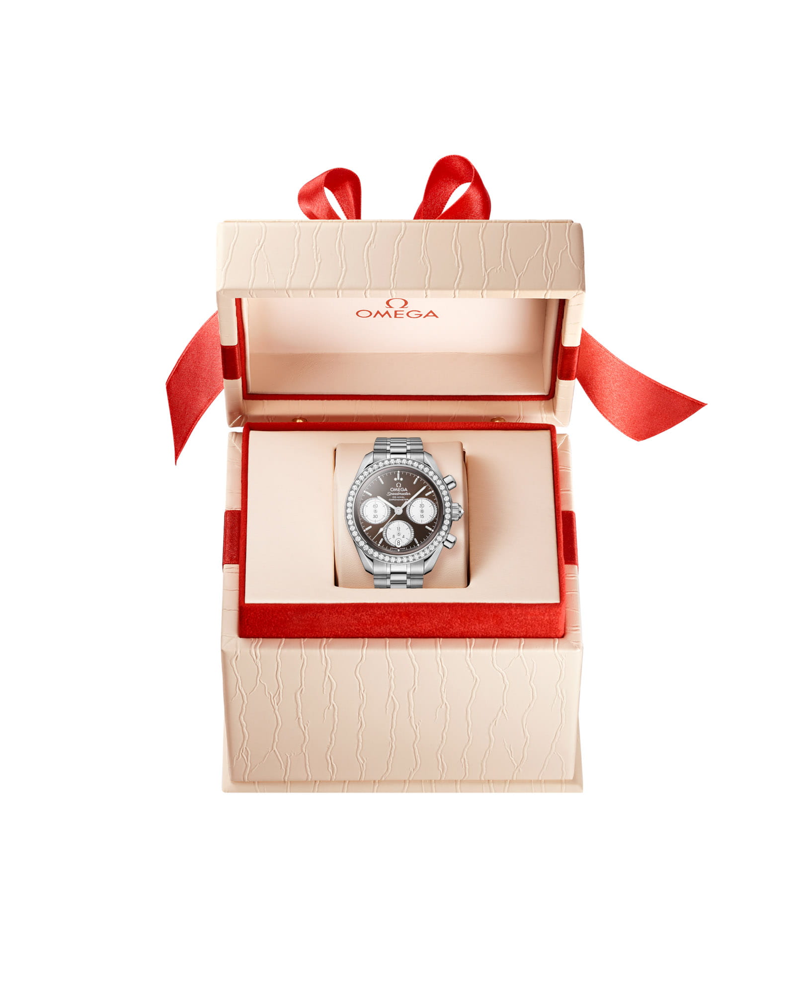 Speedmaster 38 мм переосмысливает культовый хронограф OMEGA, сохраняя его особенности в изысканном компактном формате. Полированный корпус из нержавеющей стали сияет в обрамлении безеляБезельВнешний ободок, закрепляющий стекло. В спортивных часах так называется поворотное кольцо с делениями на циферблате, выполняет роль таймера – замеряет отрезки времени на шкале. Неподвижный безель – элемент декора. Однонаправленно вращающийся безель на дайверских часах позволяет фиксировать моменты погружения и выныривания на поверхность. с 52 бриллиантами, а заводную головку венчает еще один сверкающий камень. Коричневый циферблат с PVD-покрытиемPVDУльтратонкое покрытие наносится в технике вакуумного напыления, сочетает в себе нитрид титана особой прочности со слоем золота или оксида хрома. Несёт в себе декоративную или защитную функцию. играет переливами, демонстрируя горизонтальные овальные счетчики с серебристым покрытием и вертикальное окошко даты на 6 часах. Стрелки с алмазной полировкойЛюминесцентное покрытиеПозволяет считывать показания времени в темноте. Производители наносят на стрелки, часовые индексы, безель или поверхность циферблата светонакопительный состав, дающий холодное свечение., покрытые Super-LumiNova, мерцают изумрудным светом в темноте. Браслет из нержавеющей стали с чередующейся полировкой и матовыми поверхностями оснащен фирменной системой регулировки OMEGA. На завинчивающейся задней крышке красуется медальон с морским коньком, а сердцем модели служит точный калибр OMEGA Co-Axial 3330 - современная интерпретация легендарного механизма.