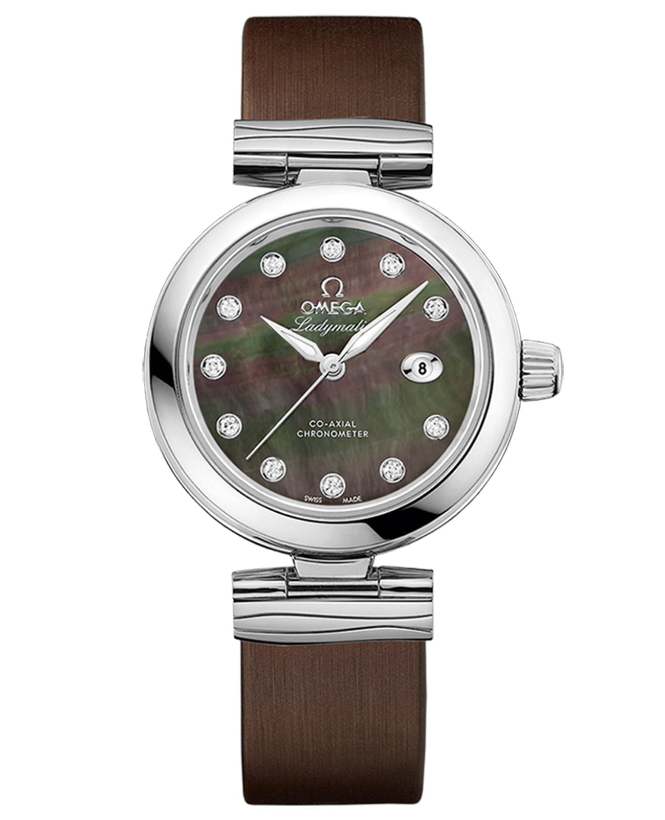 формы "альфа" и 11 бриллиантовых индексов переливаются на мерцающей поверхности циферблата из таитянского перламутра, словно лунный свет на океанских волнах. Практичное окошко даты на "3 часах" органично вписано в композицию, сохраняя безупречную эстетику. В сердце этих часов бьется калибр OMEGA 8520 с коаксиальным механизмом — символ безупречной точности и женской грации, не утративший своего очарования за десятилетия.