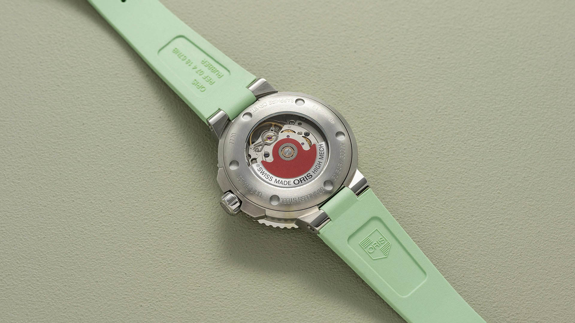 Многокомпонентный корпус из нержавеющей стали, вращающийся безельБезельВнешний ободок, закрепляющий стекло. В спортивных часах так называется поворотное кольцо с делениями на циферблате, выполняет роль таймера – замеряет отрезки времени на шкале. Неподвижный безель – элемент декора. Однонаправленно вращающийся безель на дайверских часах позволяет фиксировать моменты погружения и выныривания на поверхность. с минутной шкалой. Сапфировое стеклоСапфировое стеклоПрочный и надёжный материал из кристалла сапфира синтетического происхождения, характеризующийся особой твёрдостью и устойчивостью к царапинам и повреждениям., выпуклое с обеих сторон, внутреннее антибликовое покрытие. Прозрачная задняя крышка из минерального стеклаМинеральное стеклоМинеральное стекло представляет собой искусственно выращенный минерал кварца. Такое стекло отличается особой устойчивостью к повреждениям и царапинам. Уступает по некоторым качествам сапфировому стеклу.. Стрелки и метки с люминесцентным покрытиемЛюминесцентное покрытиеПозволяет считывать показания времени в темноте. Производители наносят на стрелки, часовые индексы, безель или поверхность циферблата светонакопительный состав, дающий холодное свечение.. Завинчивающаяся заводная головка. Каучуковый ремень.