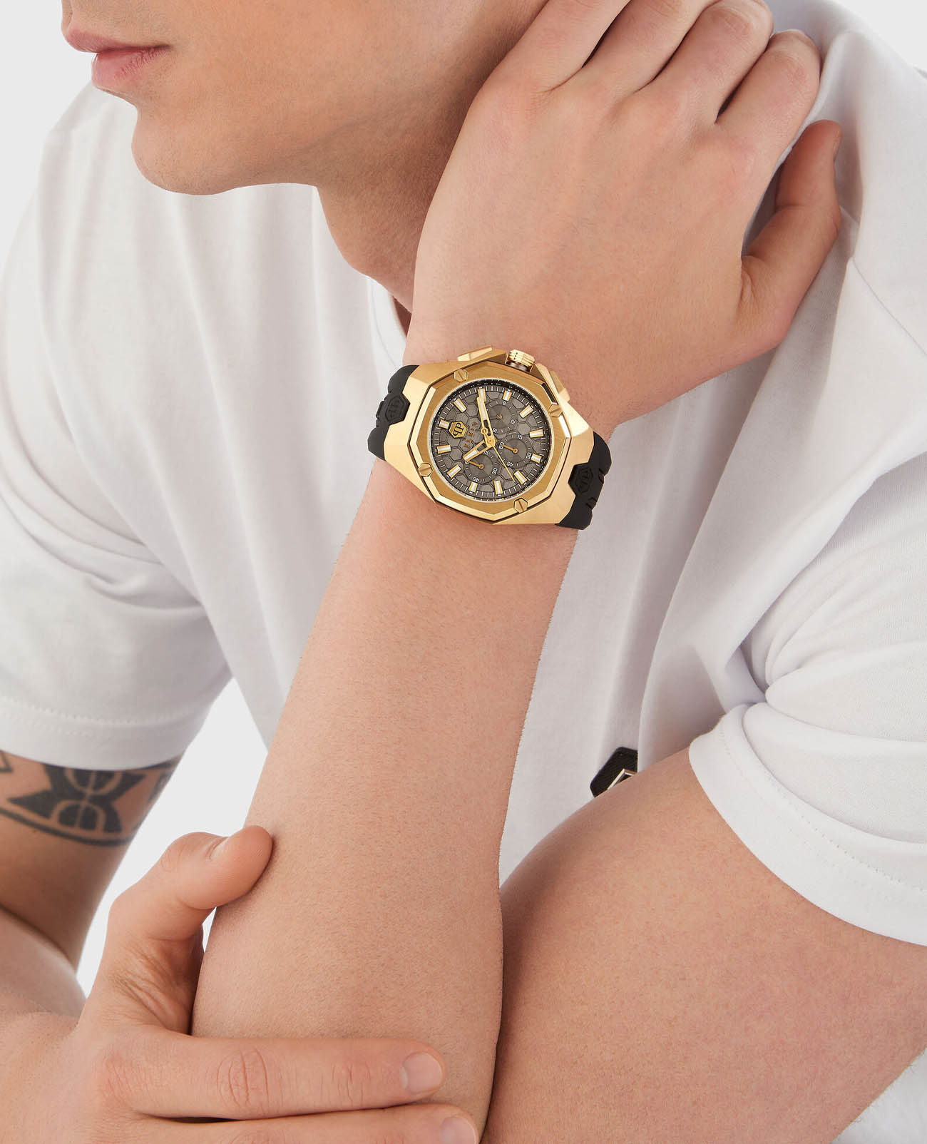 Мужские часы c хронографомХронографФункция позволяет измерять отрезки времени с особой точностью: часы, минуты, секунды. Верным признаком хронографа является наличие на циферблате 3 дополнительных окошек-счётчиков. Philipp Plein Octagon PWTBA0423, кварцевый механизм с высокой точностью. Класс водозащиты: 50 метров, позволит защитить корпус от случайных брызг или капель дождя. Корпус часов изготовлен из нержавеющей стали с IP-покрытиемIP-покрытиеМетод ионного напыления. Демонстрирует повышенную устойчивость к истиранию, окислению и химическим веществам. Под воздействием высокого давления и температуры около 1500°C молекулы металла надёжно соединяются с частицами корпуса часов.. Стрелки и метки с люминесцентным покрытиемЛюминесцентное покрытиеПозволяет считывать показания времени в темноте. Производители наносят на стрелки, часовые индексы, безель или поверхность циферблата светонакопительный состав, дающий холодное свечение.. 12 и 24-часовой формат времени Минеральное стеклоМинеральное стеклоМинеральное стекло представляет собой искусственно выращенный минерал кварца. Такое стекло отличается особой устойчивостью к повреждениям и царапинам. Уступает по некоторым качествам сапфировому стеклу. устойчивое к мелким механическим повреждениям.