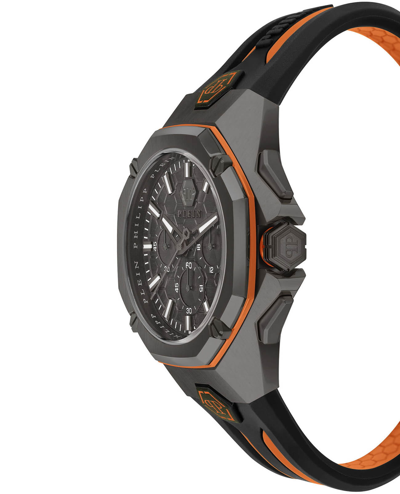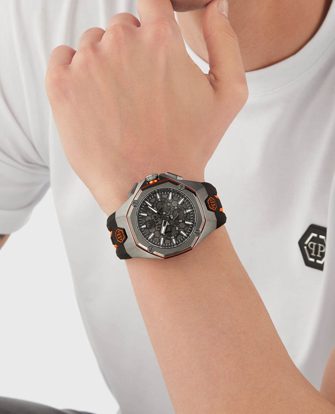 Мужские часы c хронографомХронографФункция позволяет измерять отрезки времени с особой точностью: часы, минуты, секунды. Верным признаком хронографа является наличие на циферблате 3 дополнительных окошек-счётчиков. Philipp Plein Octagon PWTBA0523, кварцевый механизм с высокой точностью. Класс водозащиты: 50 метров, позволит защитить корпус от случайных брызг или капель дождя. Корпус часов изготовлен из нержавеющей стали с IP-покрытиемIP-покрытиеМетод ионного напыления. Демонстрирует повышенную устойчивость к истиранию, окислению и химическим веществам. Под воздействием высокого давления и температуры около 1500°C молекулы металла надёжно соединяются с частицами корпуса часов.. Стрелки и метки с люминесцентным покрытиемЛюминесцентное покрытиеПозволяет считывать показания времени в темноте. Производители наносят на стрелки, часовые индексы, безель или поверхность циферблата светонакопительный состав, дающий холодное свечение.. 12 и 24-часовой формат времени. Минеральное стеклоМинеральное стеклоМинеральное стекло представляет собой искусственно выращенный минерал кварца. Такое стекло отличается особой устойчивостью к повреждениям и царапинам. Уступает по некоторым качествам сапфировому стеклу. устойчивое к мелким механическим повреждениям.