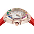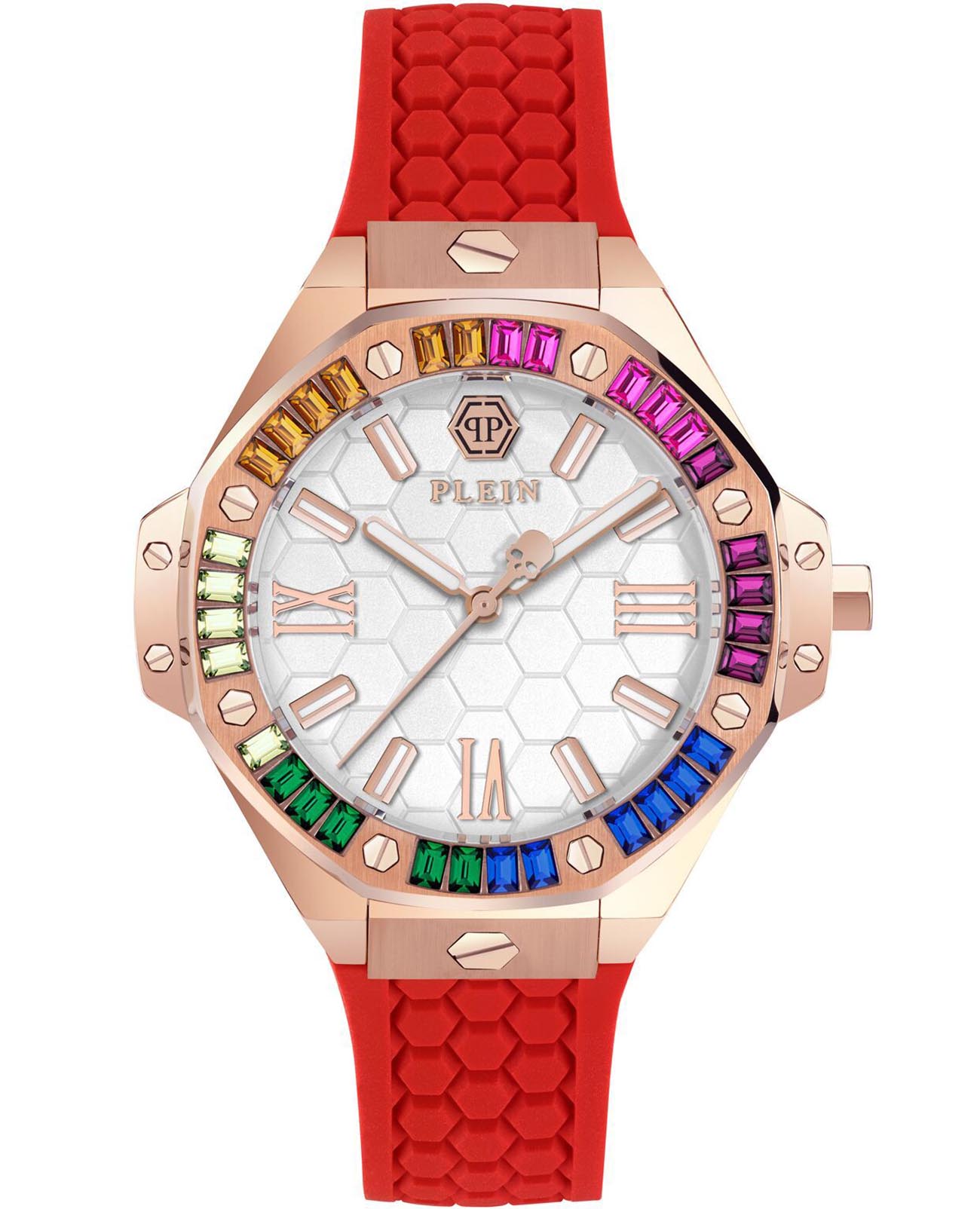 Philipp Plein Plein Lady Royal PWBDA0524 — стильные женские часы, сочетающие элегантный дизайн и функциональность. Корпус диаметром 39 мм выполнен из нержавеющей стали с розовым PVD-покрытиемPVDУльтратонкое покрытие наносится в технике вакуумного напыления, сочетает в себе нитрид титана особой прочности со слоем золота или оксида хрома. Несёт в себе декоративную или защитную функцию., что придаёт часам роскошный вид. Минеральное стеклоМинеральное стеклоМинеральное стекло представляет собой искусственно выращенный минерал кварца. Такое стекло отличается особой устойчивостью к повреждениям и царапинам. Уступает по некоторым качествам сапфировому стеклу. защищает циферблат от царапин, сохраняя его безупречный внешний вид. Циферблат инкрустирован кристаллами. Серебристый циферблат с шестиугольной текстурой подчёркивает фирменный стиль бренда. Часы оснащены кварцевым механизмом, который гарантирует точность хода. Водозащита до 5 ATM (50 метров) делает часы подходящими для повседневного использования. Ремешок из красного силикона обеспечивает комфортное ношение и надёжную фиксацию благодаря классической застёжке. Ширина ремешка 16 мм гармонично дополняет корпус, завершая стильный и современный образ.