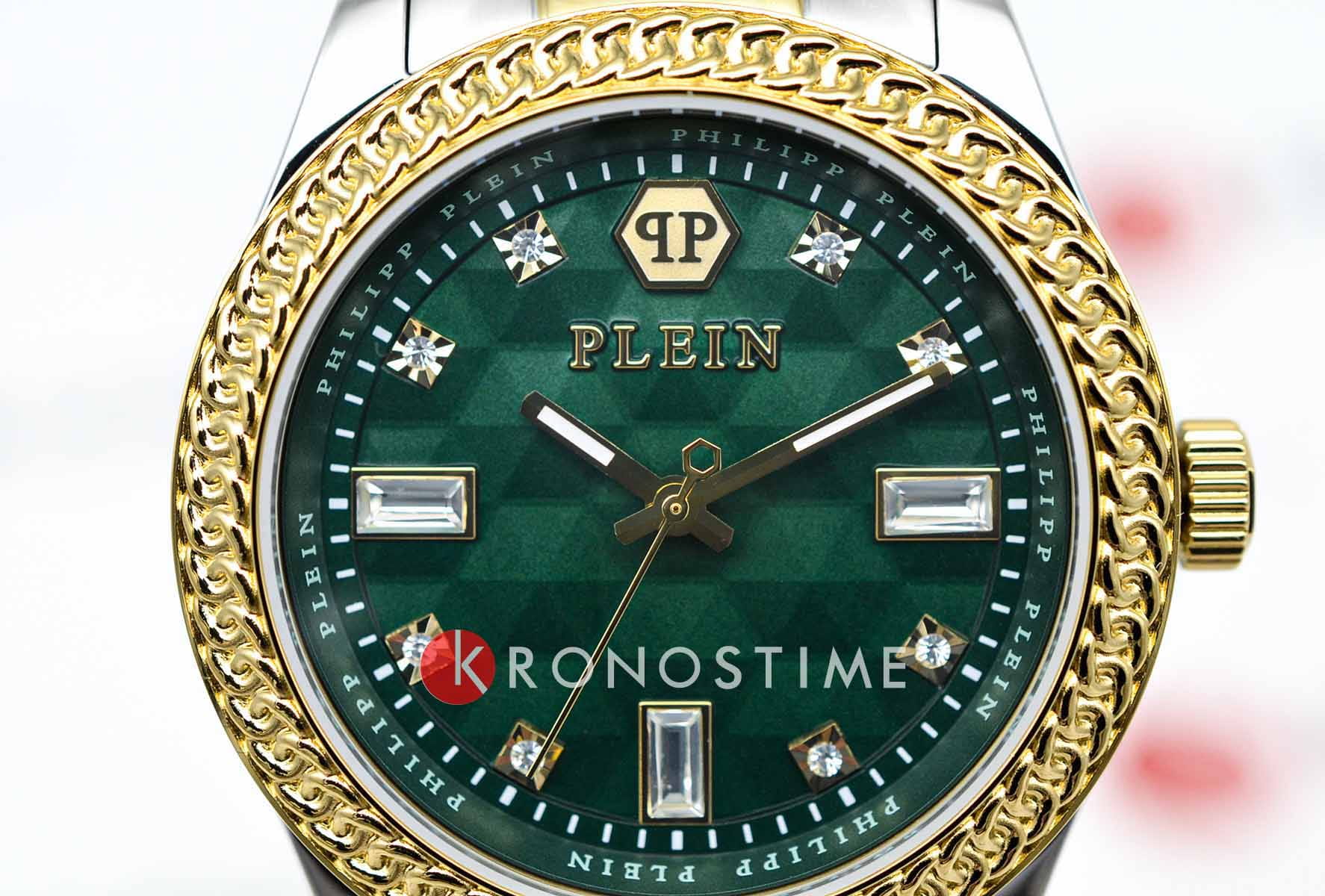 Часы Philipp Plein PWCDA0524 из коллекции Queen сочетают элегантность и функциональность. Корпус диаметром 38 мм выполнен из нержавеющей стали, придающим изделию роскошный вид. Зеленый циферблат украшен фирменным логотипом бренда в виде черепа на отметке 12 часов. БезельБезельВнешний ободок, закрепляющий стекло. В спортивных часах так называется поворотное кольцо с делениями на циферблате, выполняет роль таймера – замеряет отрезки времени на шкале. Неподвижный безель – элемент декора. Однонаправленно вращающийся безель на дайверских часах позволяет фиксировать моменты погружения и выныривания на поверхность. с IP-покрытиемIP-покрытиеМетод ионного напыления. Демонстрирует повышенную устойчивость к истиранию, окислению и химическим веществам. Под воздействием высокого давления и температуры около 1500°C молекулы металла надёжно соединяются с частицами корпуса часов..