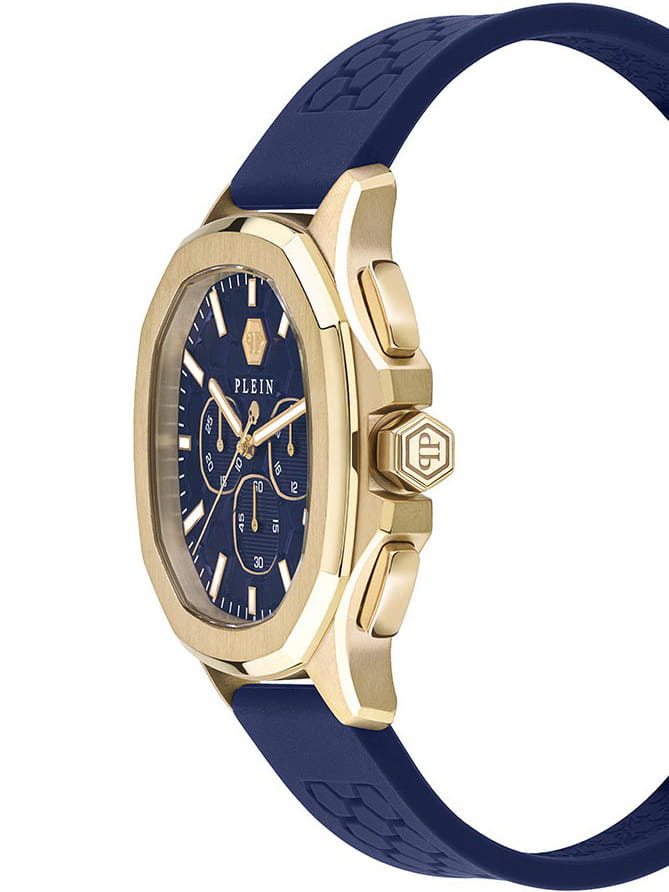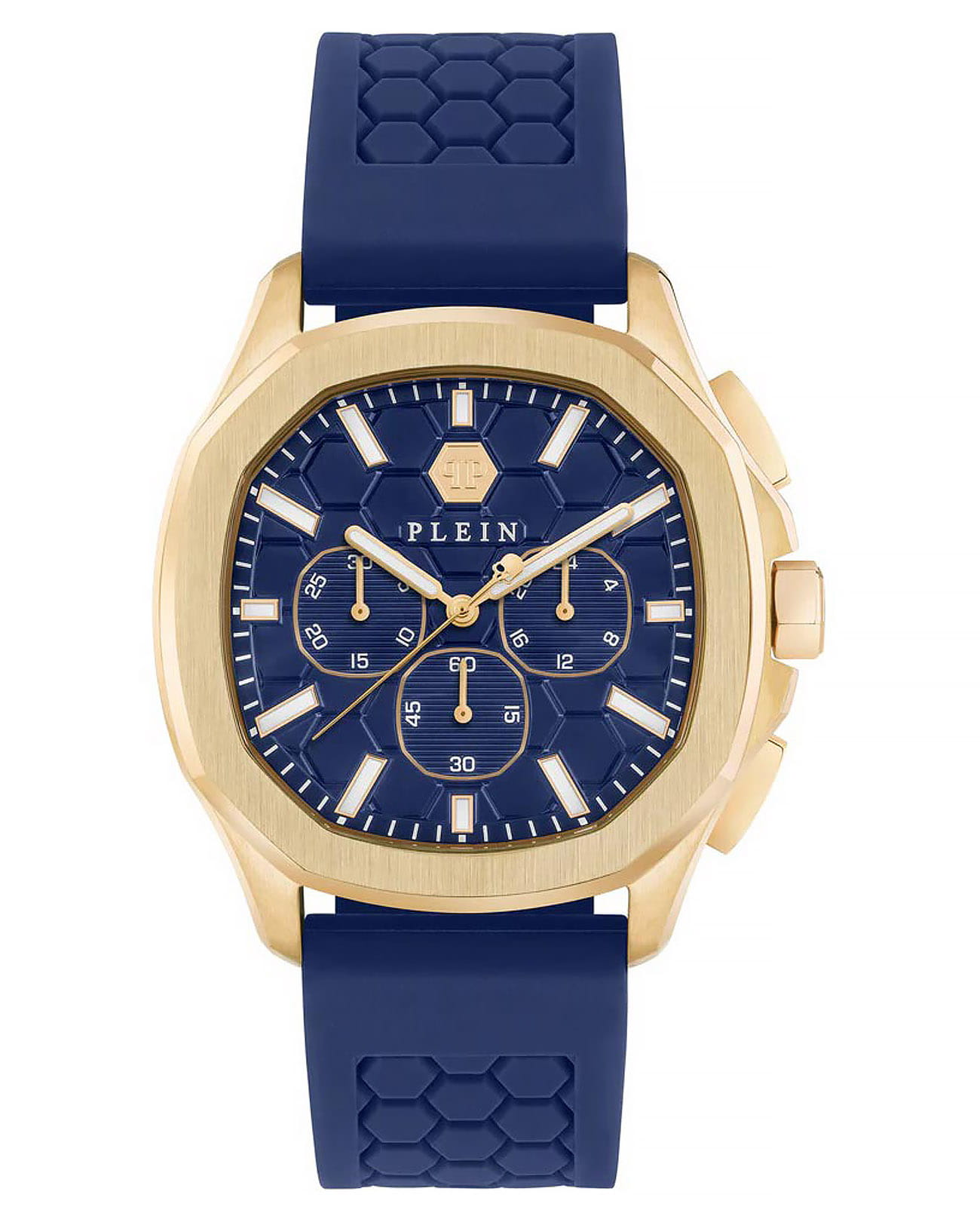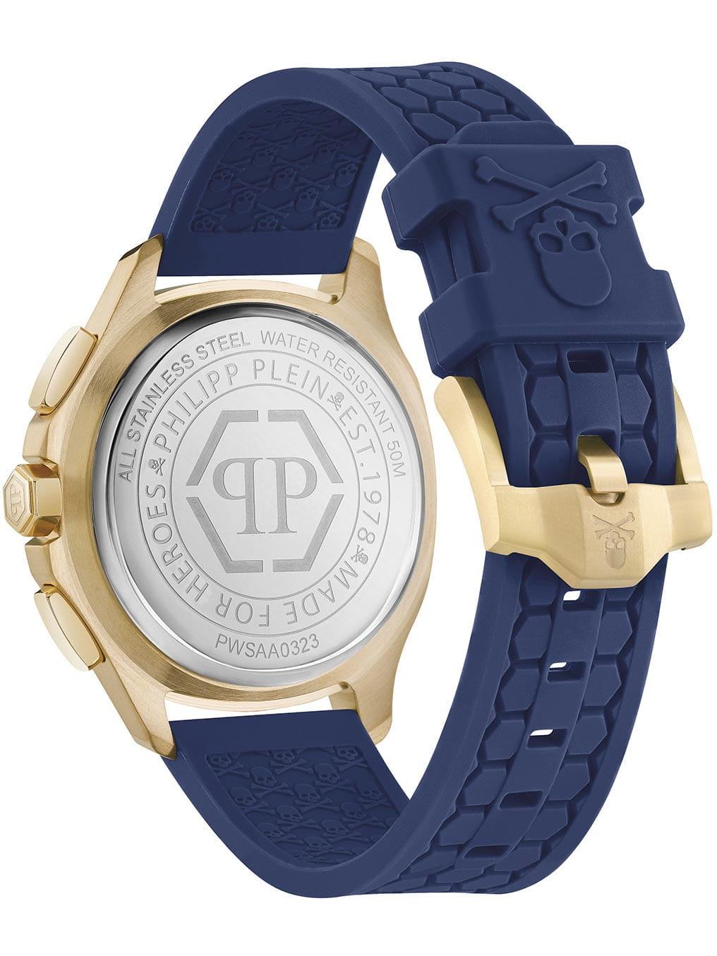 Яркие мужские часы-хронографХронографФункция позволяет измерять отрезки времени с особой точностью: часы, минуты, секунды. Верным признаком хронографа является наличие на циферблате 3 дополнительных окошек-счётчиков. с секундомеромСекундомерСекундоме́р — прибор, способный измерять интервалы времени с точностью до долей секунды.  Philipp Plein PWSAA0323, кварцевый механизм с высокой точностью. Класс водозащиты: 50 метров, позволит защитить корпус от случайных брызг или капель дождя. Корпус часов изготовлен из стали с IP-покрытиемIP-покрытиеМетод ионного напыления. Демонстрирует повышенную устойчивость к истиранию, окислению и химическим веществам. Под воздействием высокого давления и температуры около 1500°C молекулы металла надёжно соединяются с частицами корпуса часов.. Стрелки и метки с люминесцентным покрытиемЛюминесцентное покрытиеПозволяет считывать показания времени в темноте. Производители наносят на стрелки, часовые индексы, безель или поверхность циферблата светонакопительный состав, дающий холодное свечение..