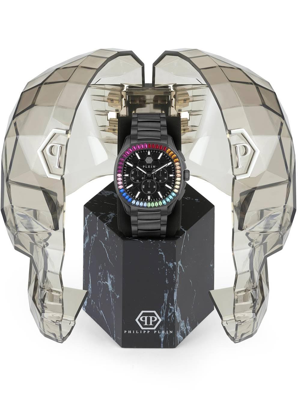 Яркие мужские часы-хронографХронографФункция позволяет измерять отрезки времени с особой точностью: часы, минуты, секунды. Верным признаком хронографа является наличие на циферблате 3 дополнительных окошек-счётчиков. с секундомеромСекундомерСекундоме́р — прибор, способный измерять интервалы времени с точностью до долей секунды.  Philipp Plein PWSAA0723, кварцевый механизм с высокой точностью. Класс водозащиты: 50 метров, позволит защитить корпус от случайных брызг или капель дождя. Корпус часов изготовлен из стали с IP-покрытиемIP-покрытиеМетод ионного напыления. Демонстрирует повышенную устойчивость к истиранию, окислению и химическим веществам. Под воздействием высокого давления и температуры около 1500°C молекулы металла надёжно соединяются с частицами корпуса часов.. Стрелки и метки с люминесцентным покрытиемЛюминесцентное покрытиеПозволяет считывать показания времени в темноте. Производители наносят на стрелки, часовые индексы, безель или поверхность циферблата светонакопительный состав, дающий холодное свечение.. Застёжка бабочка с кнопкамиЗастёжка "бабочка"Такой вид застёжки дополняется предохранителями, помогающими избежать случайного раскрытия браслета. Обладают изящным исполнением.