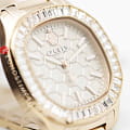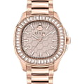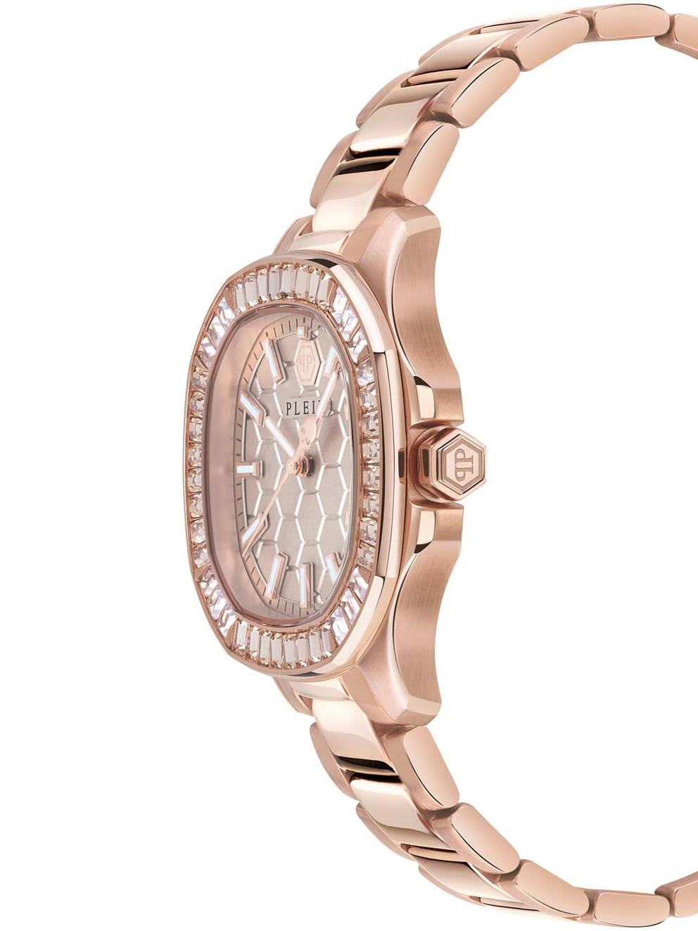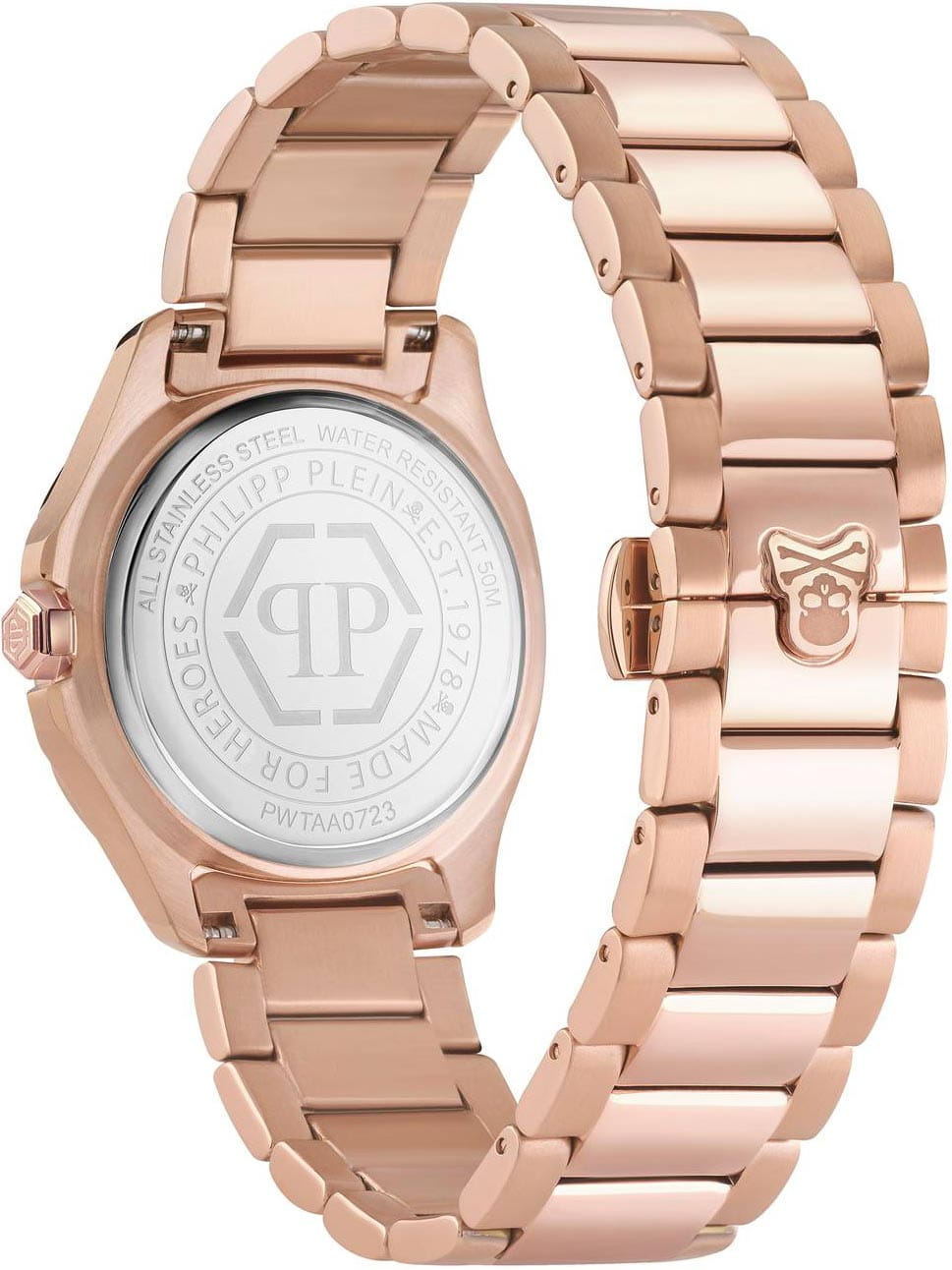 Яркие женские часы с минеральным стекломМинеральное стеклоМинеральное стекло представляет собой искусственно выращенный минерал кварца. Такое стекло отличается особой устойчивостью к повреждениям и царапинам. Уступает по некоторым качествам сапфировому стеклу. Philipp Plein PWTAA0723, кварцевый механизм с высокой точностью. Класс водозащиты: 50 метров, позволит защитить корпус от случайных брызг или капель дождя. Корпус часов изготовлен из стали с IP-покрытиемIP-покрытиеМетод ионного напыления. Демонстрирует повышенную устойчивость к истиранию, окислению и химическим веществам. Под воздействием высокого давления и температуры около 1500°C молекулы металла надёжно соединяются с частицами корпуса часов.. Стрелки и метки с люминесцентным покрытиемЛюминесцентное покрытиеПозволяет считывать показания времени в темноте. Производители наносят на стрелки, часовые индексы, безель или поверхность циферблата светонакопительный состав, дающий холодное свечение.. Стальной корпус с геометричным безелем, инкрустированным кристаллами. Застёжка бабочка с кнопкамиЗастёжка "бабочка"Такой вид застёжки дополняется предохранителями, помогающими избежать случайного раскрытия браслета. Обладают изящным исполнением.