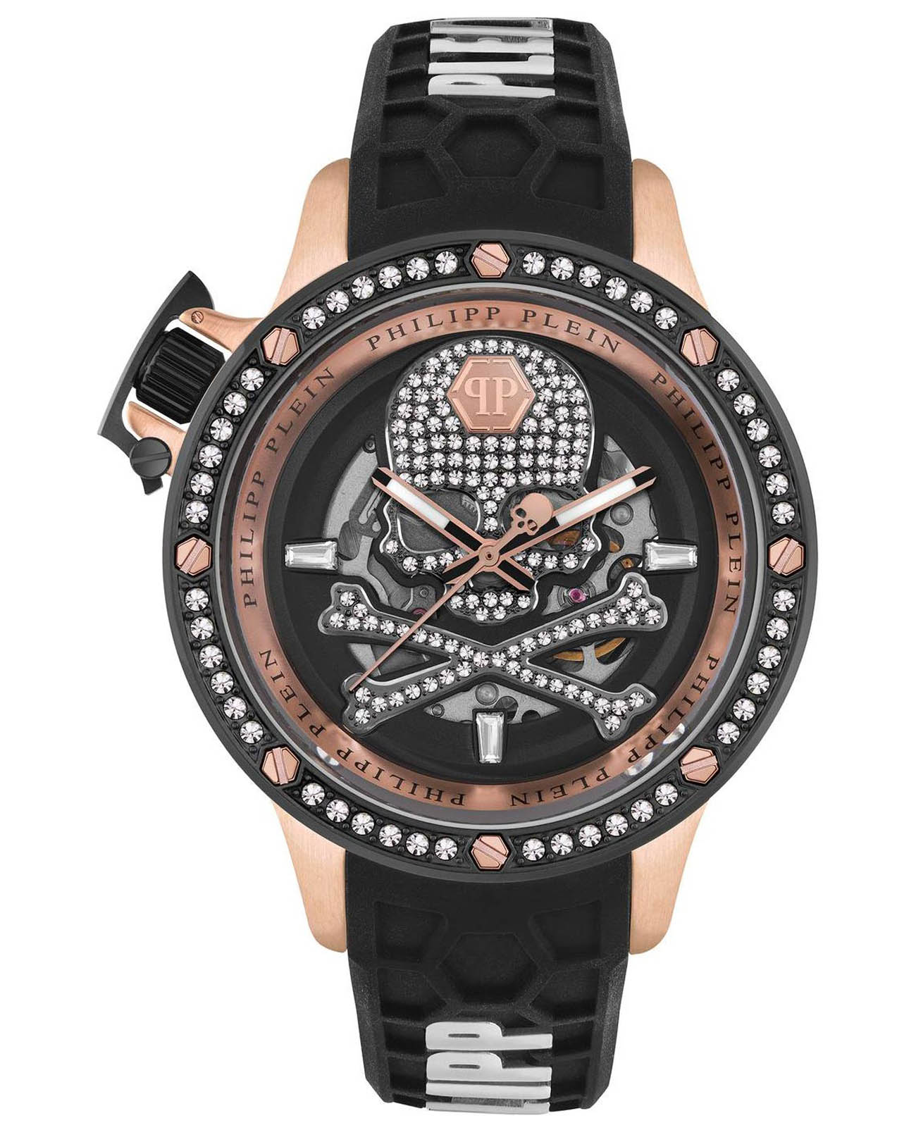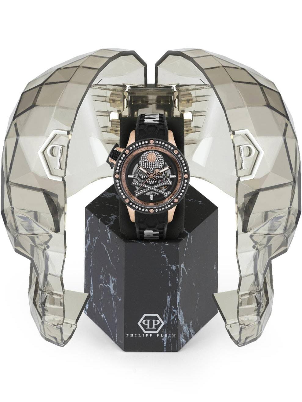 Яркие мужские часы с минеральным стекломМинеральное стеклоМинеральное стекло представляет собой искусственно выращенный минерал кварца. Такое стекло отличается особой устойчивостью к повреждениям и царапинам. Уступает по некоторым качествам сапфировому стеклу. Philipp Plein PWUAA0223, механический механизм с автоподзаводом. Класс водозащиты: 50 метров, позволит защитить корпус от случайных брызг или капель дождя. Корпус часов изготовлен из стали с IP-покрытиемIP-покрытиеМетод ионного напыления. Демонстрирует повышенную устойчивость к истиранию, окислению и химическим веществам. Под воздействием высокого давления и температуры около 1500°C молекулы металла надёжно соединяются с частицами корпуса часов. и украшен кристаллами. Стрелки и метки с люминесцентным покрытиемЛюминесцентное покрытиеПозволяет считывать показания времени в темноте. Производители наносят на стрелки, часовые индексы, безель или поверхность циферблата светонакопительный состав, дающий холодное свечение..