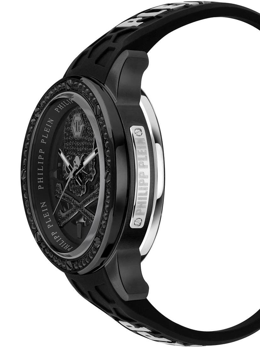 Яркие мужские часы с минеральным стекломМинеральное стеклоМинеральное стекло представляет собой искусственно выращенный минерал кварца. Такое стекло отличается особой устойчивостью к повреждениям и царапинам. Уступает по некоторым качествам сапфировому стеклу. Philipp Plein Plein Rich PWUAA0423, механический механизм с автоподзаводом. Класс водозащиты: 50 метров, позволит защитить корпус от случайных брызг или капель дождя. Корпус часов изготовлен из стали с IP-покрытиемIP-покрытиеМетод ионного напыления. Демонстрирует повышенную устойчивость к истиранию, окислению и химическим веществам. Под воздействием высокого давления и температуры около 1500°C молекулы металла надёжно соединяются с частицами корпуса часов. и украшен кристаллами. Стрелки и метки с люминесцентным покрытиемЛюминесцентное покрытиеПозволяет считывать показания времени в темноте. Производители наносят на стрелки, часовые индексы, безель или поверхность циферблата светонакопительный состав, дающий холодное свечение..