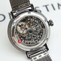 Женские механические часы с автоподзаводом Pierre Lannier Eolia 310F988. Минеральное стеклоМинеральное стеклоМинеральное стекло представляет собой искусственно выращенный минерал кварца. Такое стекло отличается особой устойчивостью к повреждениям и царапинам. Уступает по некоторым качествам сапфировому стеклу. устойчивое к мелким механическим повреждениям. Центральные часовая, минутная и секундная стрелки. Черный циферблат с открытым балансом хода украшен кристаллами. Корпус и браслет выполнен из нержавеющей стали с IP-покрытиемIP-покрытиеМетод ионного напыления. Демонстрирует повышенную устойчивость к истиранию, окислению и химическим веществам. Под воздействием высокого давления и температуры около 1500°C молекулы металла надёжно соединяются с частицами корпуса часов..  Водостойкость: 30 метров, позволит защитить корпус от случайных брызг или капель дождя. Прозрачная задняя крышка. Браслет миланского плетения с раскладной застёжкойРаскладная застёжкаТакой тип застёжки используется только на браслетах из металла. Она никогда не раскрывается полностью, происходит разделение на 2 и более частей. Раскладывающая застёжка снизит вероятность потери часов к минимуму..