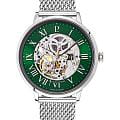 Мужские механические часы с автоподзаводом Pierre Lannier Automatic 390C171. Минеральное стеклоМинеральное стеклоМинеральное стекло представляет собой искусственно выращенный минерал кварца. Такое стекло отличается особой устойчивостью к повреждениям и царапинам. Уступает по некоторым качествам сапфировому стеклу. устойчивое к мелким механическим повреждениям. Центральные часовая, минутная и секундная стрелки. Корпус и браслет выполнены из нержавеющей стали. Водостойкость: 50 метров, позволит защитить корпус от случайных брызг или капель дождя. Стрелки с люминесцентным покрытиемЛюминесцентное покрытиеПозволяет считывать показания времени в темноте. Производители наносят на стрелки, часовые индексы, безель или поверхность циферблата светонакопительный состав, дающий холодное свечение.. Зеленый скелетонизированный циферблат. Браслет стальной, миланское плетение на раскладной застёжкеРаскладная застёжкаТакой тип застёжки используется только на браслетах из металла. Она никогда не раскрывается полностью, происходит разделение на 2 и более частей. Раскладывающая застёжка снизит вероятность потери часов к минимуму.. В комплекте дополнительный кожаный ремешок для смены стиля. Прозрачная задняя крышка. Идеальный выбор для тех, кто ценит французский дизайн, механическую поэзию и универсальный образ.