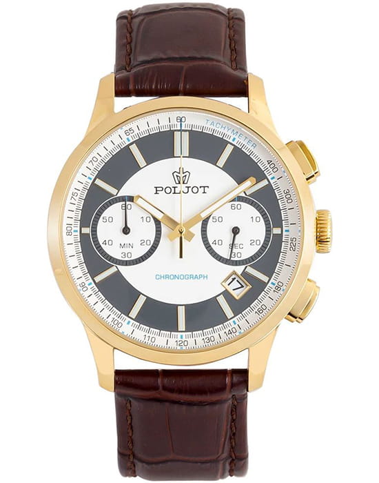 Poljot 6S21.906217 — современные мужские часы с выразительным спортивным дизайном и надёжной функциональностью. Корпус из нержавеющей стали с с PVD-покрытиемPVDУльтратонкое покрытие наносится в технике вакуумного напыления, сочетает в себе нитрид титана особой прочности со слоем золота или оксида хрома. Несёт в себе декоративную или защитную функцию. подчёркивает прочность и уверенный характер модели, а глубокий циферблат с счётчиками хронографаХронографФункция позволяет измерять отрезки времени с особой точностью: часы, минуты, секунды. Верным признаком хронографа является наличие на циферблате 3 дополнительных окошек-счётчиков. и аккуратным окном даты придаёт часам динамичный вид. Контрастные стрелки и метки с люминесцентным покрытиемЛюминесцентное покрытиеПозволяет считывать показания времени в темноте. Производители наносят на стрелки, часовые индексы, безель или поверхность циферблата светонакопительный состав, дающий холодное свечение. обеспечивают удобство считывания информации в любое время суток, а внешняя шкала тахиметраТахиметрРазмеченная шкала, располагается на ободке или безеле часов. Тахиметр позволяет рассчитать скорость на определённом участке пути, расстояние измеряется в километрах или милях. добавляет спортивную функциональность. Прочное минеральное стеклоМинеральное стеклоМинеральное стекло представляет собой искусственно выращенный минерал кварца. Такое стекло отличается особой устойчивостью к повреждениям и царапинам. Уступает по некоторым качествам сапфировому стеклу. защищает циферблат от царапин, а ремешок из натуральной кожи гарантирует комфорт и элегантную посадку на запястье. Poljot — это гармония классики и спортивного духа, созданная для мужчин, ценящих точность, надёжность и уверенный стиль.