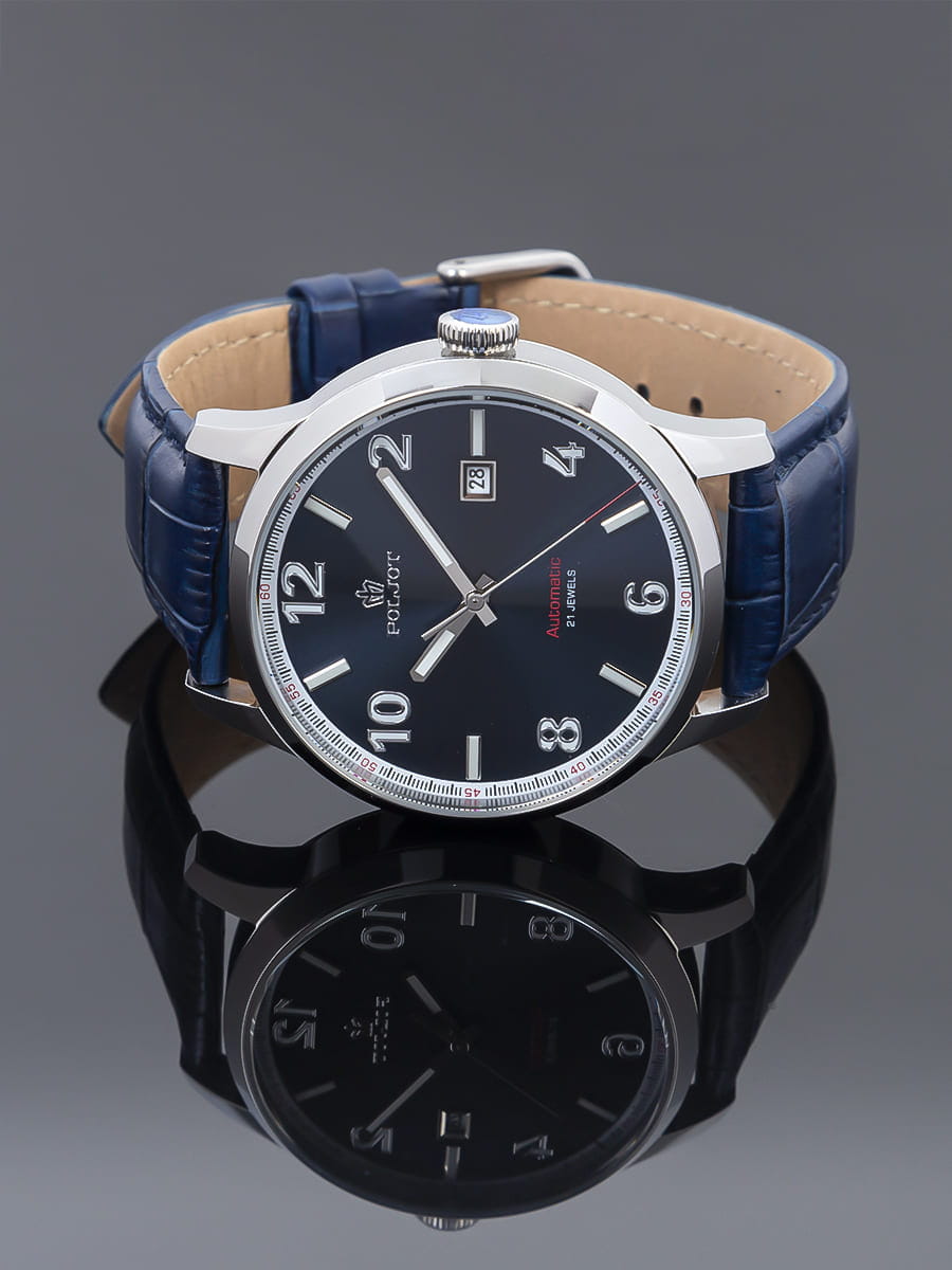 Poljot 8215.901220 — классические механические мужские часы с автоподзаводом, сочетающие сдержанный дизайн и надёжность российского часового производства. Корпус из нержавеющей стали подчёркивает строгость и универсальность модели, а циферблат с крупными арабскими цифрами и аккуратным окном даты на позиции «3 часов» обеспечивает превосходную читаемость. Стрелки и метки с люминесцентным покрытиемЛюминесцентное покрытиеПозволяет считывать показания времени в темноте. Производители наносят на стрелки, часовые индексы, безель или поверхность циферблата светонакопительный состав, дающий холодное свечение.. Механизм с автоподзаводом гарантирует стабильную работу и плавный ход стрелок. Прочное минеральное стеклоМинеральное стеклоМинеральное стекло представляет собой искусственно выращенный минерал кварца. Такое стекло отличается особой устойчивостью к повреждениям и царапинам. Уступает по некоторым качествам сапфировому стеклу. защищает циферблат от царапин, а ремешок из натуральной кожи глубокого синего цвета придаёт часам современное и элегантное звучание. Poljot — это воплощение надёжности, классики и уверенного стиля, созданное для мужчин, предпочитающих традиционную механику и безупречный внешний вид.