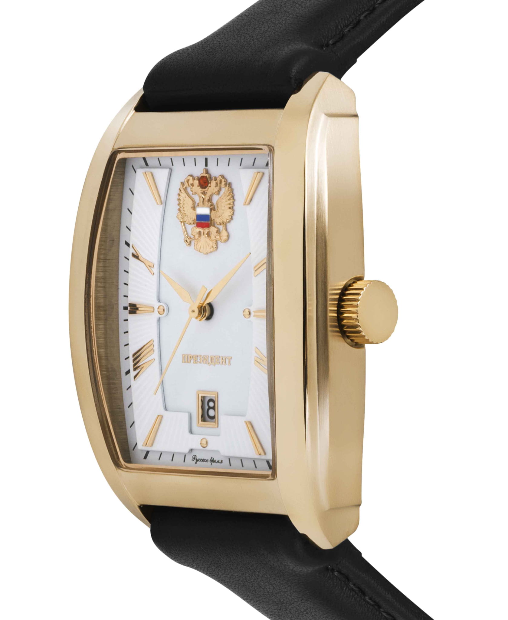 Мужские кварцевые часы из коллекции Президент — это сочетание строгого дизайна и статусного вида. Корпус прямоугольной формы выполнен в цвете желтое золото с PVD-покрытиемPVDУльтратонкое покрытие наносится в технике вакуумного напыления, сочетает в себе нитрид титана особой прочности со слоем золота или оксида хрома. Несёт в себе декоративную или защитную функцию. и защищён минеральным стекломМинеральное стеклоМинеральное стекло представляет собой искусственно выращенный минерал кварца. Такое стекло отличается особой устойчивостью к повреждениям и царапинам. Уступает по некоторым качествам сапфировому стеклу.. Циферблат дополнен окошком даты, расположенным на отметке 3 часа. Часы оснащены кожаным ремешком, обеспечивающим комфорт при ношении. Механизм — японский кварцевый Miyota, гарантирующий точное отсчёт времени. Водонепроницаемость 30 м позволяет использовать часы в повседневных условиях, защищая от случайных брызг и капель дождя. Комплектация включает подарочный футляр, паспорт с гарантийным талоном и фирменный пакет.