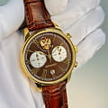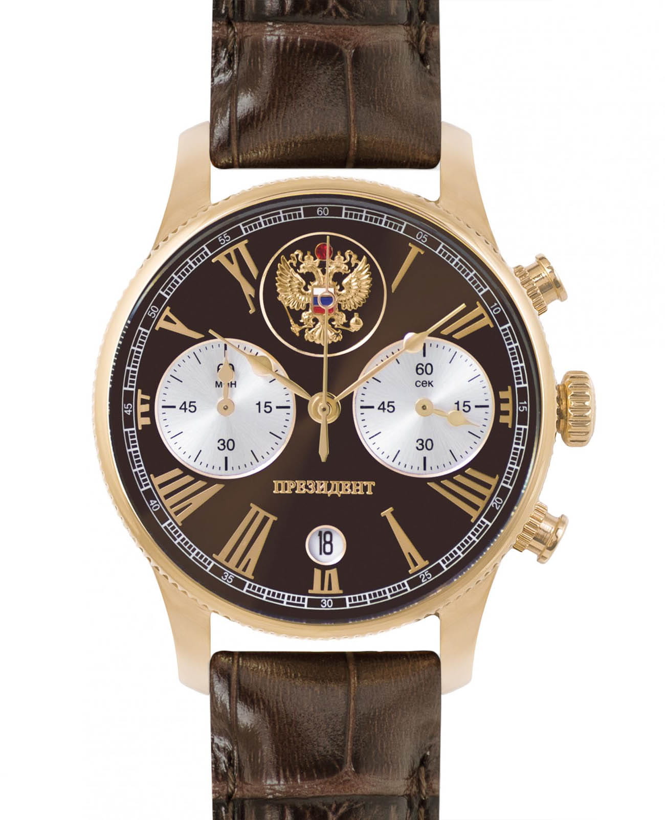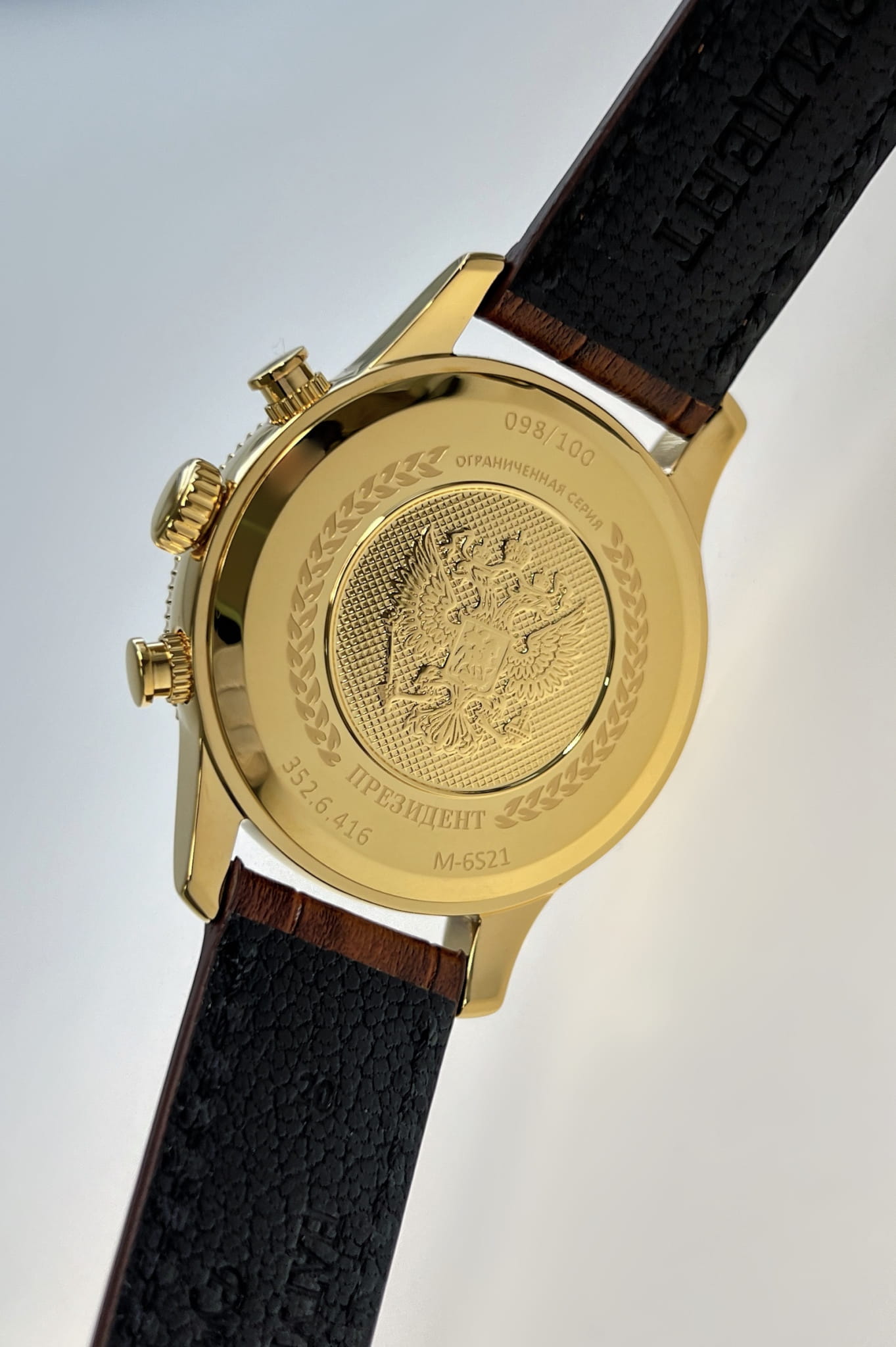 Часы «Президент» модели 3526416 — это мужские кварцевые наручные часы с хронографом, выпущенные ограниченным тиражом в 100 экземпляров. Механизм: японский кварцевый хронограф Miyota 6S21, обеспечивающий высокую точность. Функции: часы, минуты, секунды, дата, хронограф (секундомер). Корпус: из нержавеющей стали с PVD-покрытиемPVDУльтратонкое покрытие наносится в технике вакуумного напыления, сочетает в себе нитрид титана особой прочности со слоем золота или оксида хрома. Несёт в себе декоративную или защитную функцию. цвета жёлтого золота, диаметром 41,8 мм, толщиной 11,4 мм. Циферблат: чёрный с римскими цифрами и изображением государственного герба, подчёркивающий элегантный стиль. Стекло: сапфировое стеклоСапфировое стеклоПрочный и надёжный материал из кристалла сапфира синтетического происхождения, характеризующийся особой твёрдостью и устойчивостью к царапинам и повреждениям. с антибликовым покрытием, устойчивое к царапинам. Водонепроницаемость: 5 ATM (50 метров), что делает часы подходящими для повседневного использования. Ремешок: из натуральной кожи коричневого цвета, шириной 20 мм, с классической застёжкой. Эти часы — идеальный выбор для ценителей стиля и ограниченных коллекций.
