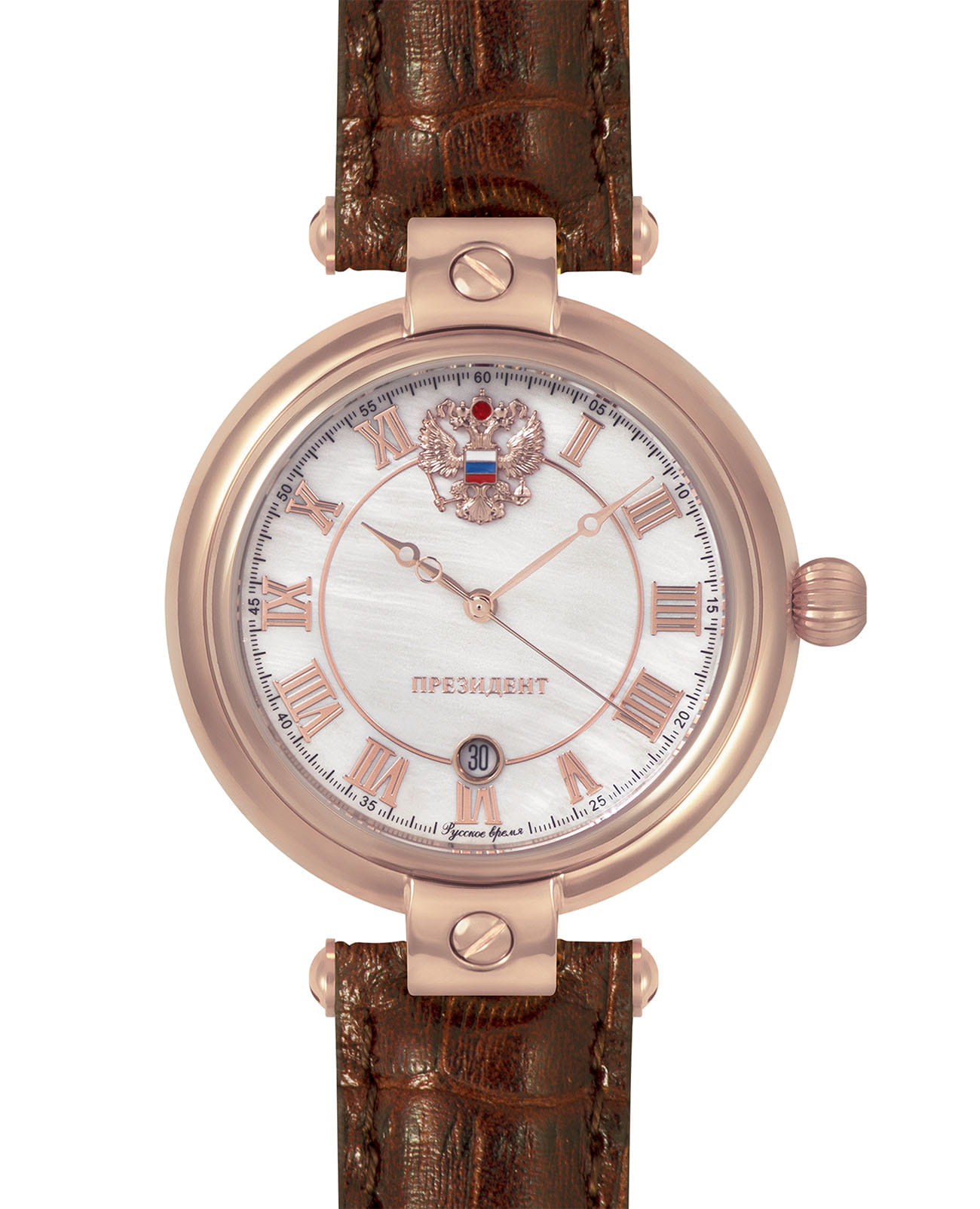 Круглые механические часы из коллекции «Президент» — это воплощение стиля и безупречного вкуса. Модель выполнена в форме с розовым золотом, а корпус диаметром 42 мм с толщиной 14 мм защищён сапфировым стекломСапфировое стеклоПрочный и надёжный материал из кристалла сапфира синтетического происхождения, характеризующийся особой твёрдостью и устойчивостью к царапинам и повреждениям., устойчивым к царапинам и обеспечивающим чёткое восприятие информации при любом освещении. Циферблат украшен кристаллами Swarovski. Часы оснащены механизмом с автоподзаводом, гарантирующим точность и надёжность. В комплект поставки входит подарочный футляр, паспорт с гарантийным талоном и фирменный пакет, что делает модель идеальным выбором для подарка. Задняя крышка с чеканкой Герба России подчёркивает национальную принадлежность и уникальность модели. Кожаный ремешок шириной 20 мм дополнен классической застёжкой, обеспечивая комфорт и элегантный стиль. Часы водонепроницаемы до 30 метров (), что позволяет использовать их в повседневных условиях — при мытье рук или под лёгким дождём. Эти часы станут универсальным аксессуаром для тех, кто ценит сочетание стиля, качества и символики — идеальный выбор для делового образа и торжественных случаев.