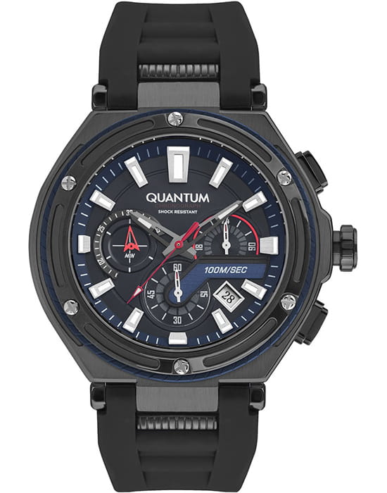 Мужские наручные часы-хронографХронографФункция позволяет измерять отрезки времени с особой точностью: часы, минуты, секунды. Верным признаком хронографа является наличие на циферблате 3 дополнительных окошек-счётчиков. Quantum HNG1010.051, кварцевый механизм с высокой точностью. Класс водозащиты: 100 метров, позволит плавать, нырять и заниматься другими водными видами спорта. Корпус часов изготовлен из стали с PVD-покрытиемPVDУльтратонкое покрытие наносится в технике вакуумного напыления, сочетает в себе нитрид титана особой прочности со слоем золота или оксида хрома. Несёт в себе декоративную или защитную функцию.. Стрелки и метки с люминесцентным покрытиемЛюминесцентное покрытиеПозволяет считывать показания времени в темноте. Производители наносят на стрелки, часовые индексы, безель или поверхность циферблата светонакопительный состав, дающий холодное свечение.. Каучуковый ремешок.