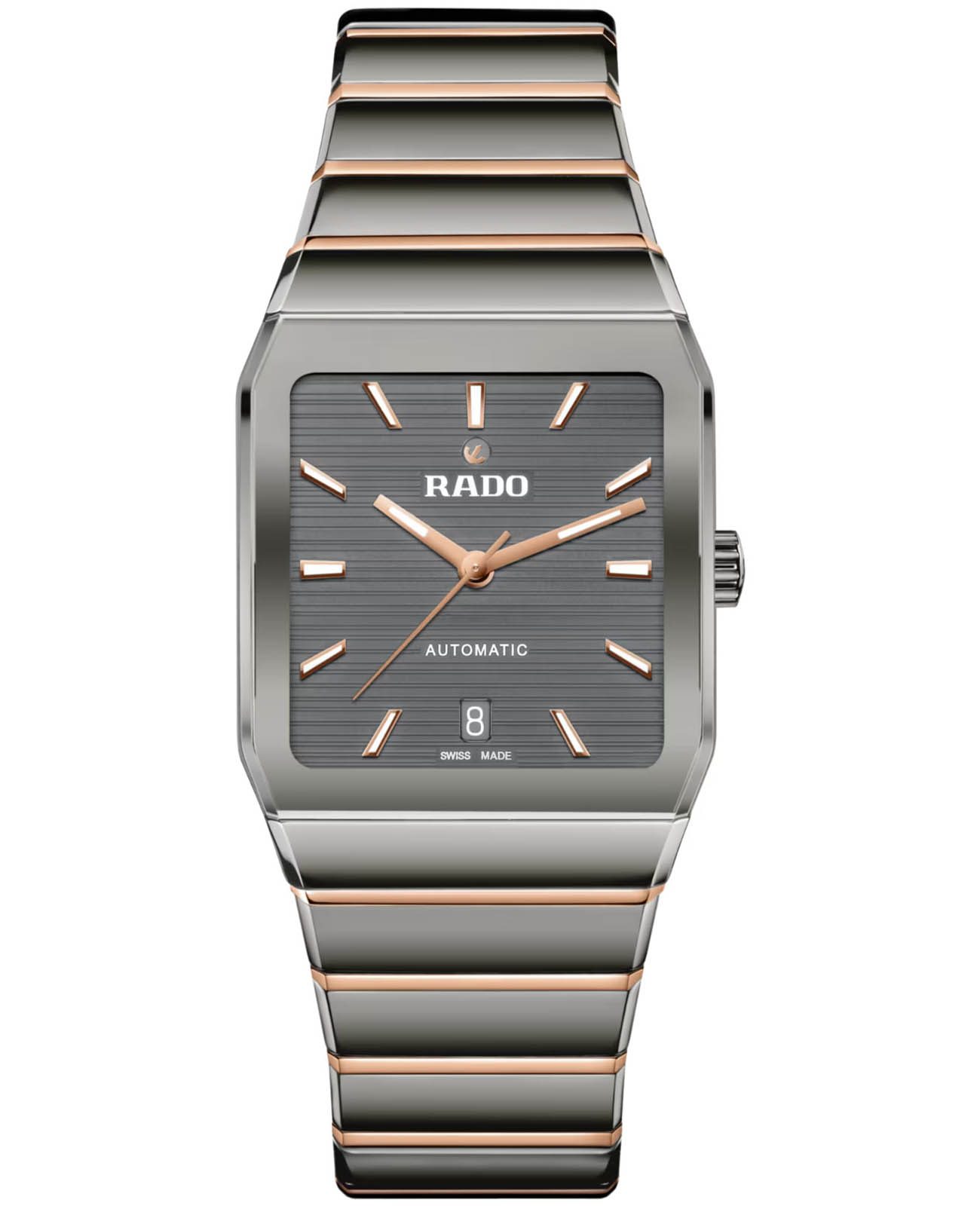 Мужские швейцарские механические часы Rado Anatom Automatic R10203102. Сапфировое стеклоСапфировое стеклоПрочный и надёжный материал из кристалла сапфира синтетического происхождения, характеризующийся особой твёрдостью и устойчивостью к царапинам и повреждениям. устойчивое к мелким механическим повреждениям. Корпус часов изготовлен из нержавеющей стали и керамики. Стрелки с люминесцентным покрытиемЛюминесцентное покрытиеПозволяет считывать показания времени в темноте. Производители наносят на стрелки, часовые индексы, безель или поверхность циферблата светонакопительный состав, дающий холодное свечение.. Венчает циферблат на отметке 12 часов культовый подвижный якорь, дополненный сдержанным окошком даты, расположенным на отметке 6 часов. Класс водозащиты: 50 метров, позволит защитить корпус от случайных брызг или капель дождя. Стальной браслет и керамика на застёжке-бабочке с кнопкамиЗастёжка "бабочка"Такой вид застёжки дополняется предохранителями, помогающими избежать случайного раскрытия браслета. Обладают изящным исполнением. .