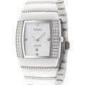 Часы Rado Sintra R13632709, произведение искусства и технологическое чудо, станут прекрасным дополнением к коллекции. Эти швейцарские часы оснащены кварцевым механизмом с указателем даты и тремя стрелками, заключенным в корпус из нержавеющей стали.  Браслет изготовлен из высокотехнологичной керамикиВысокотехнологичная керамикаИнновационный запатентованный Rado материал с гладкой или матовой поверхностью. Керамика за счёт кристаллической структуры обладает повышенной устойчивостью от возникновения царапин. Материал способен принимать температуру тела человека, обеспечивая невероятный комфорт при ношении.  с раскладной застёжкойРаскладная застёжкаТакой тип застёжки используется только на браслетах из металла. Она никогда не раскрывается полностью, происходит разделение на 2 и более частей. Раскладывающая застёжка снизит вероятность потери часов к минимуму.. Корпус украшен 48 бриллиантами, циферблат 4 бриллианта, браслет 102 бриллианта. Сапфировое стеклоСапфировое стеклоПрочный и надёжный материал из кристалла сапфира синтетического происхождения, характеризующийся особой твёрдостью и устойчивостью к царапинам и повреждениям. устойчивое к появлению царапин, обладающее высокой прозрачностью. Класс водозащиты: 30 метров, позволит защитить корпус от случайных брызг или капель дождя.