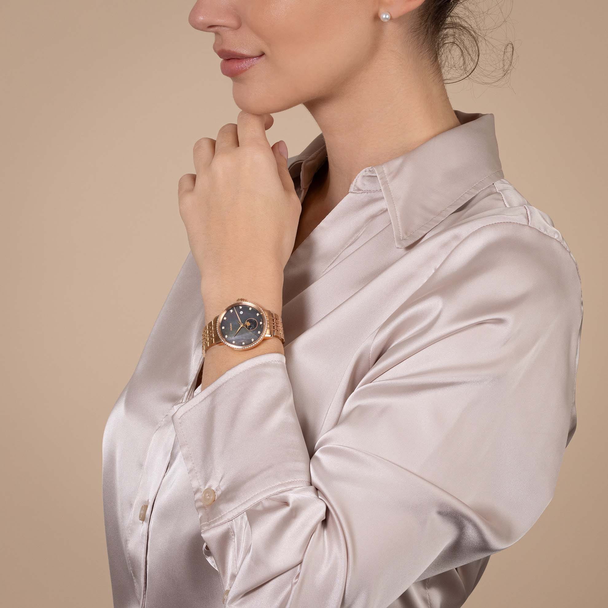 Женские кварцевые часы Rado Coupole — это элегантный аксессуар с изысканным дизайном. Корпус диаметром 34 мм и толщиной 9,7 мм выполнен из нержавеющей стали с PVD-покрытиемPVDУльтратонкое покрытие наносится в технике вакуумного напыления, сочетает в себе нитрид титана особой прочности со слоем золота или оксида хрома. Несёт в себе декоративную или защитную функцию. розового золота. БезельБезельВнешний ободок, закрепляющий стекло. В спортивных часах так называется поворотное кольцо с делениями на циферблате, выполняет роль таймера – замеряет отрезки времени на шкале. Неподвижный безель – элемент декора. Однонаправленно вращающийся безель на дайверских часах позволяет фиксировать моменты погружения и выныривания на поверхность. и заводная головка также покрыты розовым PVD. Циферблат из темного перламутра украшен 12 бриллиантами и индикатором фазы Луны. Циферблат защищён выпуклым сапфировым стекломСапфировое стеклоПрочный и надёжный материал из кристалла сапфира синтетического происхождения, характеризующийся особой твёрдостью и устойчивостью к царапинам и повреждениям.. Механизм — кварцевый. Часы оснащены девятирядным браслетом из нержавеющей стали с PVD-покрытиемPVDУльтратонкое покрытие наносится в технике вакуумного напыления, сочетает в себе нитрид титана особой прочности со слоем золота или оксида хрома. Несёт в себе декоративную или защитную функцию. розового золота и трёхсекционной застёжкой из титана и стали с PVD-покрытиемPVDУльтратонкое покрытие наносится в технике вакуумного напыления, сочетает в себе нитрид титана особой прочности со слоем золота или оксида хрома. Несёт в себе декоративную или защитную функцию.. Универсальный выбор для тех, кто ценит роскошь, женственность и швейцарское качество.