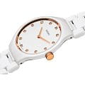 Белые керамические часы будут настоящим украшением вашего запястья, классическая расцветка позволяет носить часы в сочетании с любой одеждой. Вместо часовых индексов использовано 12 бриллиантов в 0,067 карат, роскошное исполнение идеально подойдет для привлечения внимания к имиджу элегантной бизнес-леди. Корпус выполнен из сочетания нержавеющей стали 316L и высокотехнологичной керамикиВысокотехнологичная керамикаИнновационный запатентованный Rado материал с гладкой или матовой поверхностью. Керамика за счёт кристаллической структуры обладает повышенной устойчивостью от возникновения царапин. Материал способен принимать температуру тела человека, обеспечивая невероятный комфорт при ношении., что позволяет получить дополнительную устойчивость к царапинам. Кварцевый механизм ETA 282.001. Сапфировое стекло. Износоустойчивое PVD-покрытиеPVDУльтратонкое покрытие наносится в технике вакуумного напыления, сочетает в себе нитрид титана особой прочности со слоем золота или оксида хрома. Несёт в себе декоративную или защитную функцию.. Водонепроницаемость 30 метров.. Отображение даты. Диаметр корпуса: 30 мм.