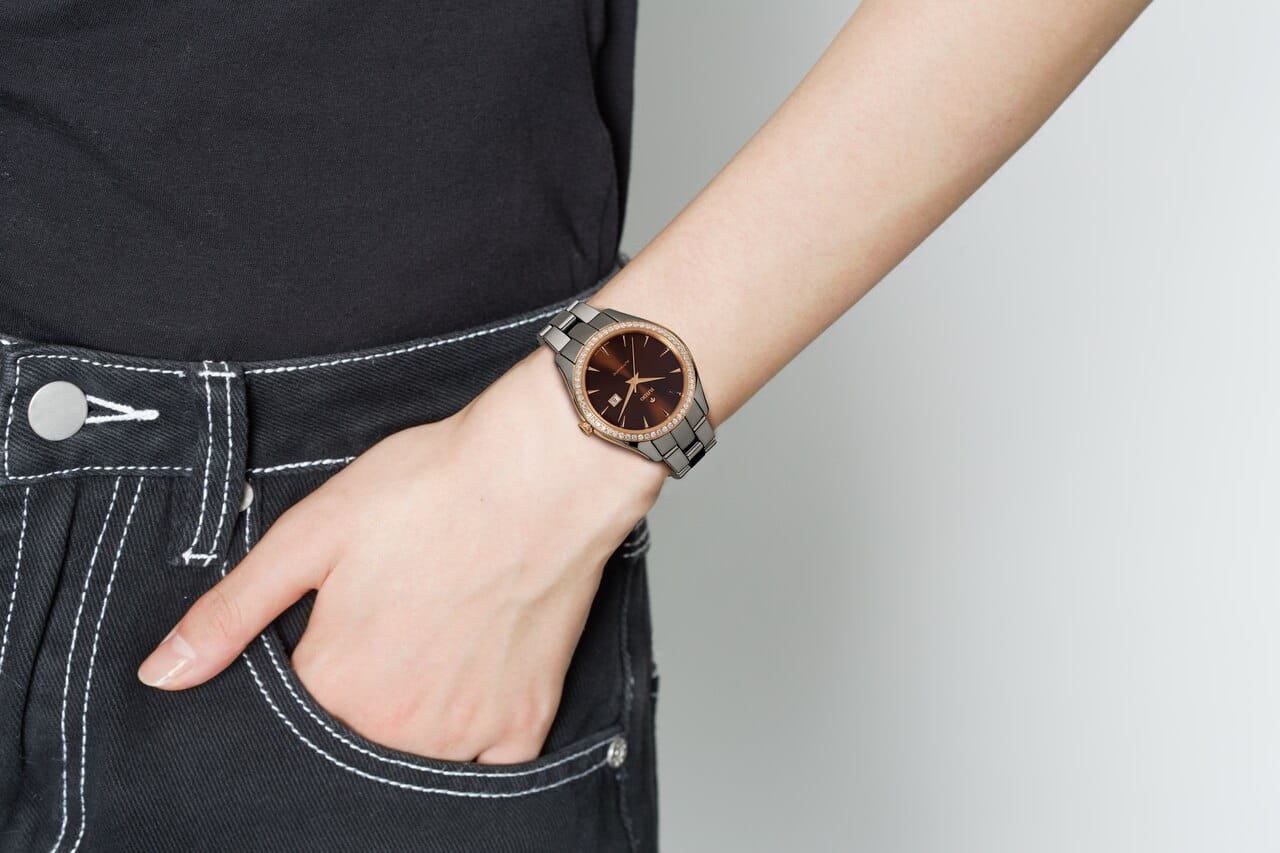 Аксессуар премиальной категории приковывает взгляды, оригинальный внешний вид очаровывает, хочется поближе рассмотреть каждую деталь. Циферблат «солнечные лучи» гармонирует с безелемБезельВнешний ободок, закрепляющий стекло. В спортивных часах так называется поворотное кольцо с делениями на циферблате, выполняет роль таймера – замеряет отрезки времени на шкале. Неподвижный безель – элемент декора. Однонаправленно вращающийся безель на дайверских часах позволяет фиксировать моменты погружения и выныривания на поверхность., декорированным 60-ю бриллиантами в 0,390 карат. Калибр ETA 2681. Стекло из сапфира имеет антибликовое покрытие. Корпус из плазменной керамикиВысокотехнологичная плазменная керамикаИнновационный материал, технология запатентована. Выплавление керамики осуществляется в печи при 20 000 °C, белоснежный материал под воздействием ультравысокой температуры приобретает уникальный блеск, присущий металлам. и нержавеющей стали, керамический браслет со вставками из материала CeramosCeramosМатериал являет собой инновационное сочетание высокотехнологичной керамики и сплава металла. Он объединяет керамическую устойчивость к царапинам и металлический роскошный блеск. .Сохранение водонепроницаемости при давлении до 5 бар. . Индикация даты. Диаметр корпуса: 36 мм.