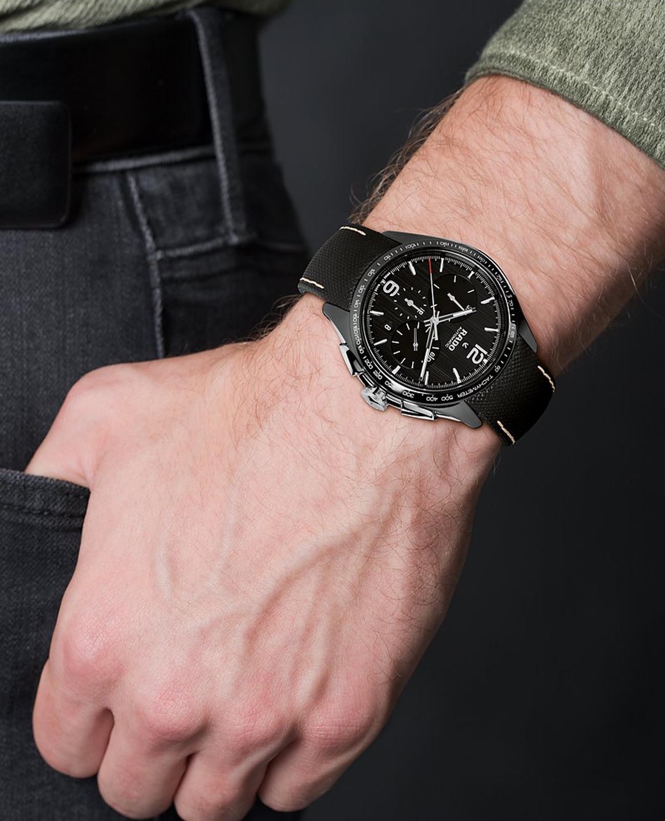 Мужские швейцарские часы-хронографХронографФункция позволяет измерять отрезки времени с особой точностью: часы, минуты, секунды. Верным признаком хронографа является наличие на циферблате 3 дополнительных окошек-счётчиков. Rado HyperChrome Automatic Chronograph R32121155. Корпус часов изготовлен из нержавеющей стали с PVD-покрытиемPVDУльтратонкое покрытие наносится в технике вакуумного напыления, сочетает в себе нитрид титана особой прочности со слоем золота или оксида хрома. Несёт в себе декоративную или защитную функцию. и высокотехнологичной керамикиВысокотехнологичная керамикаИнновационный запатентованный Rado материал с гладкой или матовой поверхностью. Керамика за счёт кристаллической структуры обладает повышенной устойчивостью от возникновения царапин. Материал способен принимать температуру тела человека, обеспечивая невероятный комфорт при ношении.. Тканевый ремешок на стандартной застёжке. Сапфировое стеклоСапфировое стеклоПрочный и надёжный материал из кристалла сапфира синтетического происхождения, характеризующийся особой твёрдостью и устойчивостью к царапинам и повреждениям. устойчивое к мелким механическим повреждениям. Стрелки и метки с люминесцентным покрытиемЛюминесцентное покрытиеПозволяет считывать показания времени в темноте. Производители наносят на стрелки, часовые индексы, безель или поверхность циферблата светонакопительный состав, дающий холодное свечение.. Окошко даты находится в положении между 4 и 5 часов. Класс водозащиты: 100 метров, позволит плавать, нырять и заниматься другими водными видами спорта. БезельБезельВнешний ободок, закрепляющий стекло. В спортивных часах так называется поворотное кольцо с делениями на циферблате, выполняет роль таймера – замеряет отрезки времени на шкале. Неподвижный безель – элемент декора. Однонаправленно вращающийся безель на дайверских часах позволяет фиксировать моменты погружения и выныривания на поверхность. со шкалой тахиметраТахиметрРазмеченная шкала, располагается на ободке или безеле часов. Тахиметр позволяет рассчитать скорость на определённом участке пути, расстояние измеряется в километрах или милях..