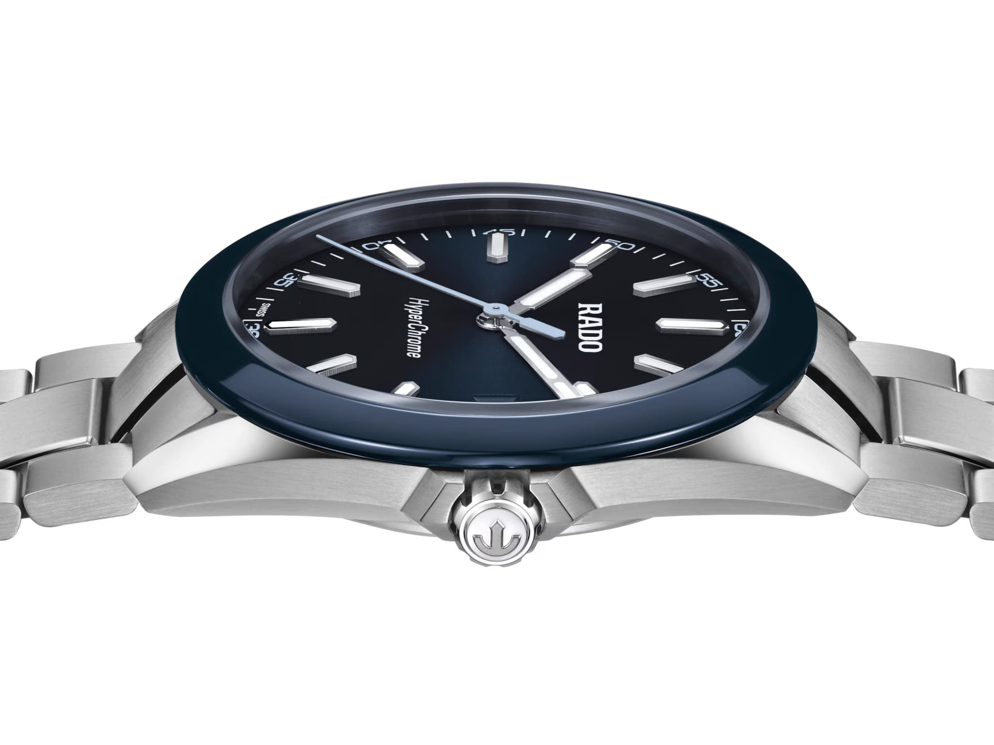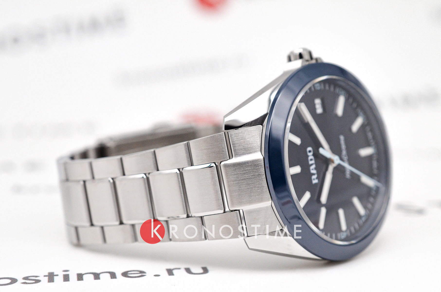 Мужские кварцевые часы Rado HyperChrome — это современное воплощение точности и мастерства материалов. Корпус диаметром 41,5 мм и толщиной 11,7 мм выполнен из полированной и матовой нержавеющей стали. БезельБезельВнешний ободок, закрепляющий стекло. В спортивных часах так называется поворотное кольцо с делениями на циферблате, выполняет роль таймера – замеряет отрезки времени на шкале. Неподвижный безель – элемент декора. Однонаправленно вращающийся безель на дайверских часах позволяет фиксировать моменты погружения и выныривания на поверхность. изготовлен из высокотехнологичной керамикиВысокотехнологичная керамикаИнновационный запатентованный Rado материал с гладкой или матовой поверхностью. Керамика за счёт кристаллической структуры обладает повышенной устойчивостью от возникновения царапин. Материал способен принимать температуру тела человека, обеспечивая невероятный комфорт при ношении. синего цвета, придающей часам прочность и изысканность. Циферблат синего цвета с лакированным покрытием оформлен индексами и стрелками с люминесцентным покрытиемЛюминесцентное покрытиеПозволяет считывать показания времени в темноте. Производители наносят на стрелки, часовые индексы, безель или поверхность циферблата светонакопительный состав, дающий холодное свечение. Super-Luminova®. Особенность подсветки — зелёное свечение метки 12 часов и минутной стрелки, и синее — остальных индексов и часовой стрелки, что обеспечивает интуитивное считывание времени в темноте. Циферблат защищён выпуклым сапфировым стекломСапфировое стеклоПрочный и надёжный материал из кристалла сапфира синтетического происхождения, характеризующийся особой твёрдостью и устойчивостью к царапинам и повреждениям. с антибликовым покрытиемАнтибликовое покрытиеСлой оксида металла в 0,13-0,3 микрон, благодаря которому стекло часов не бликует и не отражает свет. Антибликовое покрытие уменьшает отражение света в 10 раз, обеспечивая отличную читаемость показателей циферблата. на внутренней стороне. Механизм — кварцевый. Окошко даты расположено в положении 3 часов. Часы оснащены трёхрядным стальным браслетом с центральными звеньями и трёхсекционной застёжкой с системой быстрой регулировки. Водонепроницаемость 150 м позволяет использовать часы для плавания и повседневного ношения. Идеальный выбор для тех, кто ценит инновации, точность и смелый дизайн.