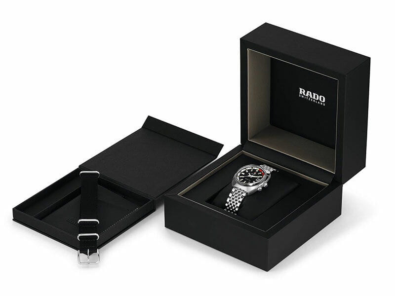 Премиальная модель привлекает винтажными деталями, оригинальным элементом стали стрелки в виде меча и стрелы. Чёрный безельБезельВнешний ободок, закрепляющий стекло. В спортивных часах так называется поворотное кольцо с делениями на циферблате, выполняет роль таймера – замеряет отрезки времени на шкале. Неподвижный безель – элемент декора. Однонаправленно вращающийся безель на дайверских часах позволяет фиксировать моменты погружения и выныривания на поверхность. изготовлен из высокотехнологичной керамикиВысокотехнологичная керамикаИнновационный запатентованный Rado материал с гладкой или матовой поверхностью. Керамика за счёт кристаллической структуры обладает повышенной устойчивостью от возникновения царапин. Материал способен принимать температуру тела человека, обеспечивая невероятный комфорт при ношении., устойчивой к возникновению царапин. Аксессуар выполнен в спортивном стиле, но сдержанная цветовая гамма и лаконичный облик позволяет ему удачно гармонировать с деловой одеждой. Наручные часы работают от автоматического швейцарского механизма ETA C07.611, сохраняющего запас хода до 80 часов. Сапфировое стекло имеет антибликовую обработку. Завинчивающаяся заводная головка и задняя крышка усиливают водостойкость до 220 метров. Для стрелок используется люминесцентное покрытиеЛюминесцентное покрытиеПозволяет считывать показания времени в темноте. Производители наносят на стрелки, часовые индексы, безель или поверхность циферблата светонакопительный состав, дающий холодное свечение.. Отображение числа на метке 3 часов. В комплект входит сменный текстильный ремень и инструмент для замены ремешка..