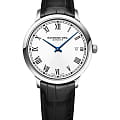 Циферблат белого цвета украшен центральными часовой и минутной стрелками, а в позиции 3 часа расположена удобная апертура даты.