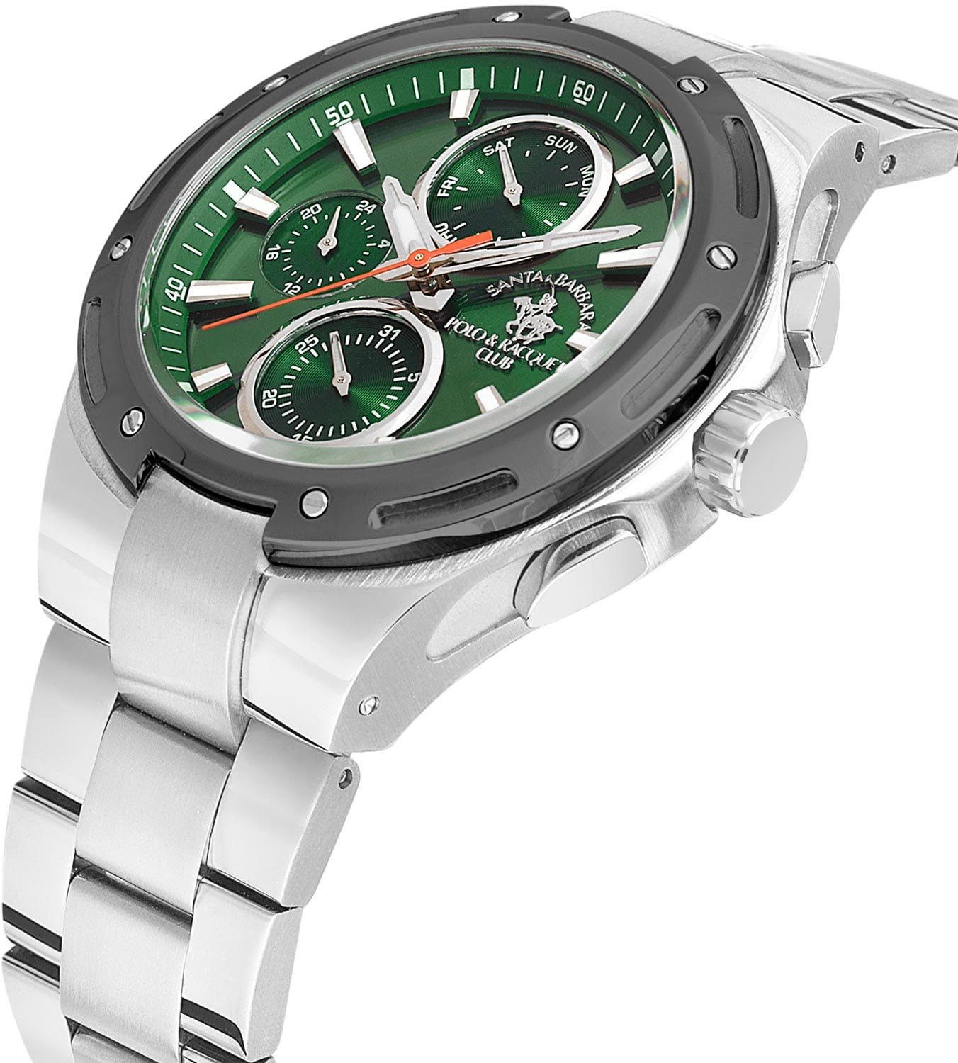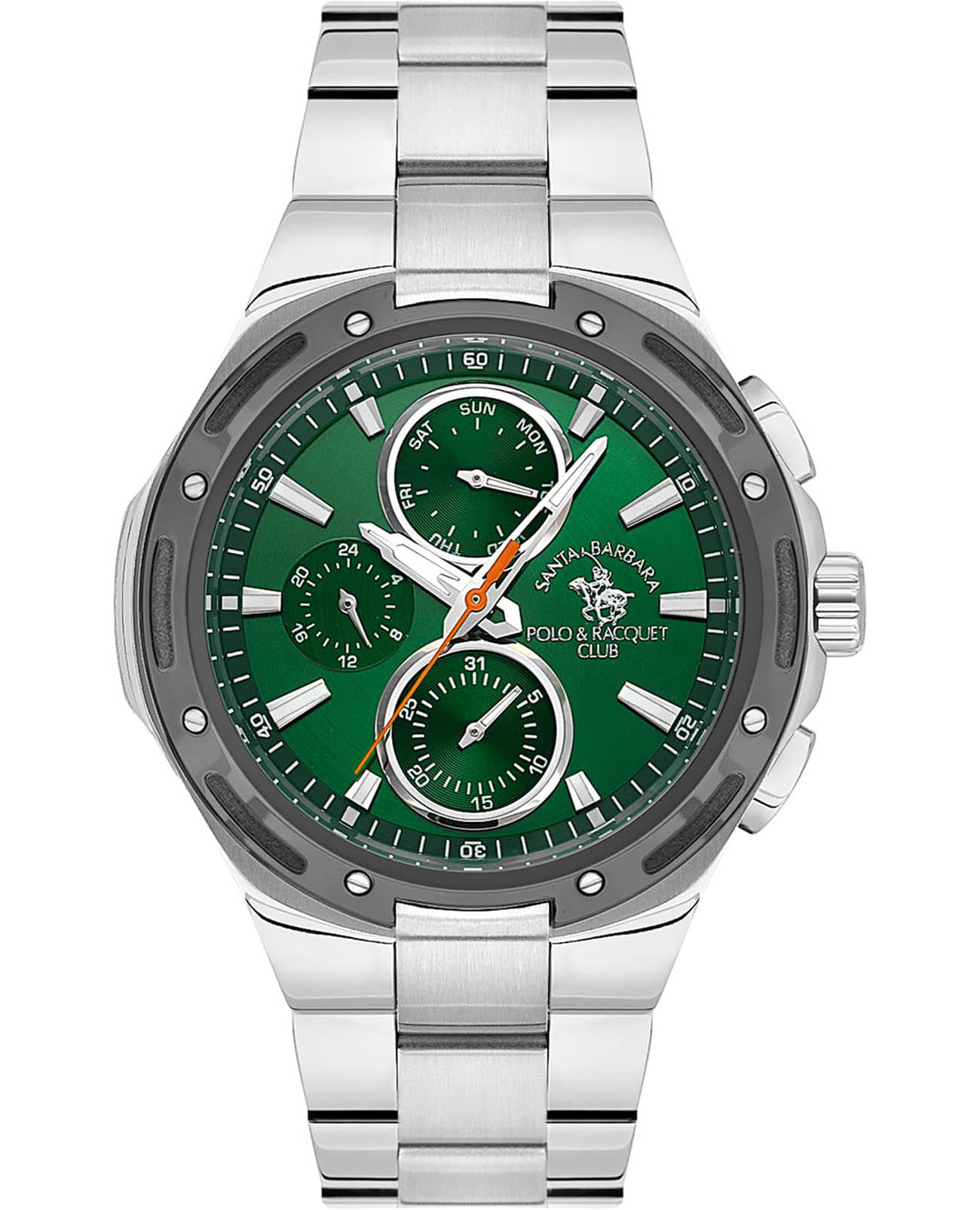 Мужские кварцевые часы Santa Barbara Polo & Racquet Club — это эффектный и функциональный аксессуар. Корпус диаметром 44 мм выполнен из стали с матовой и полированной отделкой. БезельБезельВнешний ободок, закрепляющий стекло. В спортивных часах так называется поворотное кольцо с делениями на циферблате, выполняет роль таймера – замеряет отрезки времени на шкале. Неподвижный безель – элемент декора. Однонаправленно вращающийся безель на дайверских часах позволяет фиксировать моменты погружения и выныривания на поверхность. из нержавеющей стали с IP-покрытиемIP-покрытиеМетод ионного напыления. Демонстрирует повышенную устойчивость к истиранию, окислению и химическим веществам. Под воздействием высокого давления и температуры около 1500°C молекулы металла надёжно соединяются с частицами корпуса часов.. Циферблат зелёного цвета оформлен по технологии Sunray («солнечные лучи»), дополнен накладными метками в виде штрихов и фирменным логотипом. Указатели дня недели и даты вынесены на отдельные субциферблаты, также присутствует индикация 24-часового формата времени. Стрелки заострённые, прямоугольные, в стиле Baton, с люминесцентным покрытиемЛюминесцентное покрытиеПозволяет считывать показания времени в темноте. Производители наносят на стрелки, часовые индексы, безель или поверхность циферблата светонакопительный состав, дающий холодное свечение., обеспечивающим хорошую читаемость в темноте. Метки также имеют люминесцентное покрытие. Циферблат защищён минеральным стекломМинеральное стеклоМинеральное стекло представляет собой искусственно выращенный минерал кварца. Такое стекло отличается особой устойчивостью к повреждениям и царапинам. Уступает по некоторым качествам сапфировому стеклу.. Часы оснащены стальным браслетом с раскладной застёжкойРаскладная застёжкаТакой тип застёжки используется только на браслетах из металла. Она никогда не раскрывается полностью, происходит разделение на 2 и более частей. Раскладывающая застёжка снизит вероятность потери часов к минимуму.. Водонепроницаемость 50 м позволяет использовать часы в повседневных условиях. Идеальный выбор для тех, кто ценит стиль, точность и надёжность.
