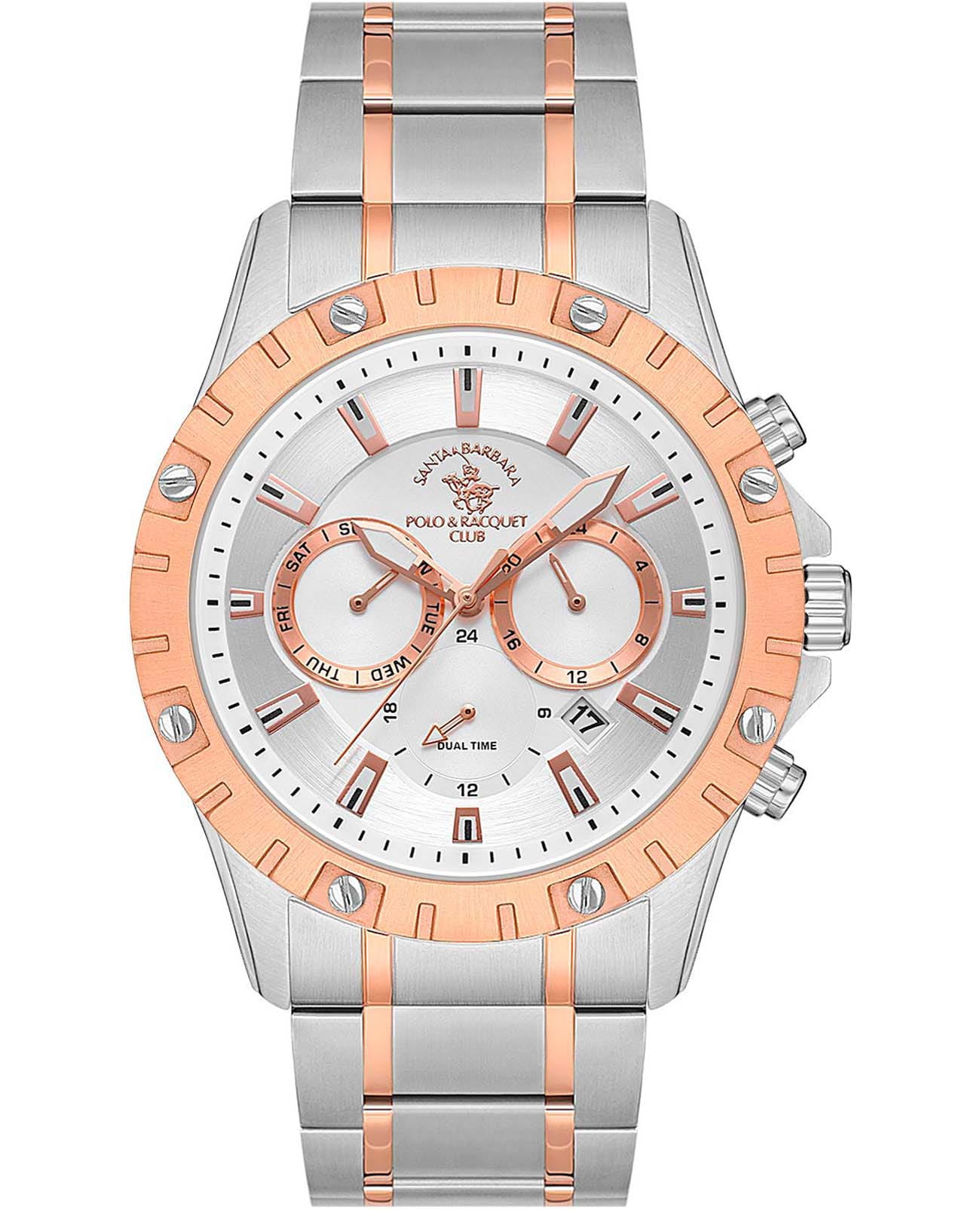 Santa Barbara Polo & Racquet Club Legend SB.1.10545-5 — стильные мужские часы, сочетающие спортивную динамику и функциональность. Крупный корпус выполнен из нержавеющей стали 316L с неподвижным безелемБезельВнешний ободок, закрепляющий стекло. В спортивных часах так называется поворотное кольцо с делениями на циферблате, выполняет роль таймера – замеряет отрезки времени на шкале. Неподвижный безель – элемент декора. Однонаправленно вращающийся безель на дайверских часах позволяет фиксировать моменты погружения и выныривания на поверхность. с IP-покрытиемIP-покрытиеМетод ионного напыления. Демонстрирует повышенную устойчивость к истиранию, окислению и химическим веществам. Под воздействием высокого давления и температуры около 1500°C молекулы металла надёжно соединяются с частицами корпуса часов. и гармонично дополнен стальным браслетом с IP-покрытиемIP-покрытиеМетод ионного напыления. Демонстрирует повышенную устойчивость к истиранию, окислению и химическим веществам. Под воздействием высокого давления и температуры около 1500°C молекулы металла надёжно соединяются с частицами корпуса часов. на раскладной застёжкеРаскладная застёжкаТакой тип застёжки используется только на браслетах из металла. Она никогда не раскрывается полностью, происходит разделение на 2 и более частей. Раскладывающая застёжка снизит вероятность потери часов к минимуму.. Циферблат с акцентными метками и стрелками с люминесцентным покрытиемЛюминесцентное покрытиеПозволяет считывать показания времени в темноте. Производители наносят на стрелки, часовые индексы, безель или поверхность циферблата светонакопительный состав, дающий холодное свечение. оформлен в многослойной структуре и оснащён вспомогательными индикаторами, 12-ти и 24-х часовой формат времени. В нижней части расположено окошко даты, что делает модель ещё более практичной. Минеральное стеклоМинеральное стеклоМинеральное стекло представляет собой искусственно выращенный минерал кварца. Такое стекло отличается особой устойчивостью к повреждениям и царапинам. Уступает по некоторым качествам сапфировому стеклу. защищает циферблат от царапин, а кварцевый механизм обеспечивает высокую точность. Водонепроницаемость 50 метров позволит защитить корпус от случайных брызг или капель дождя. Благодаря своей универсальной эстетике эти часы уместны и в деловой среде, и в повседневном образе.