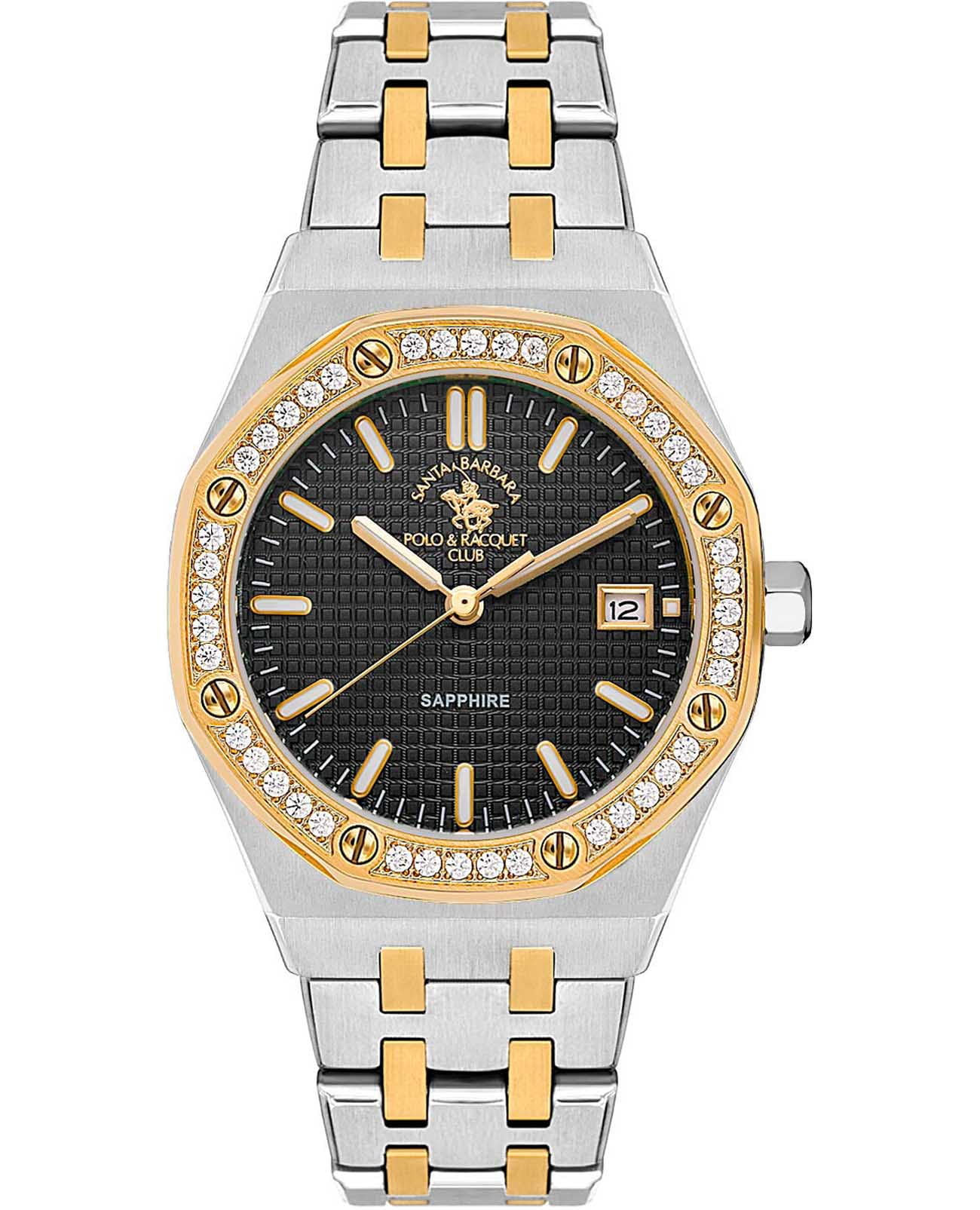 Женские кварцевые часы Santa Barbara Polo & Racquet Club Luxury SB.1.10554-4 — это стильный аксессуар, подчеркивающий индивидуальность. Изысканный корпус диаметром 34 мм выполнен из нержавеющей стали 316L с безелемБезельВнешний ободок, закрепляющий стекло. В спортивных часах так называется поворотное кольцо с делениями на циферблате, выполняет роль таймера – замеряет отрезки времени на шкале. Неподвижный безель – элемент декора. Однонаправленно вращающийся безель на дайверских часах позволяет фиксировать моменты погружения и выныривания на поверхность. с IP-покрытиемIP-покрытиеМетод ионного напыления. Демонстрирует повышенную устойчивость к истиранию, окислению и химическим веществам. Под воздействием высокого давления и температуры около 1500°C молекулы металла надёжно соединяются с частицами корпуса часов., украшенным кристаллами. Изящный циферблат дополнен накладными метками в виде штрихов, а также фирменным логотипом. Стрелки и метки с люминесцентным покрытиемЛюминесцентное покрытиеПозволяет считывать показания времени в темноте. Производители наносят на стрелки, часовые индексы, безель или поверхность циферблата светонакопительный состав, дающий холодное свечение., обеспечивающим хорошую читаемость в темноте. Защиту циферблата обеспечивает минеральное стеклоМинеральное стеклоМинеральное стекло представляет собой искусственно выращенный минерал кварца. Такое стекло отличается особой устойчивостью к повреждениям и царапинам. Уступает по некоторым качествам сапфировому стеклу. с сапфировым покрытием, устойчивое к мелким механическим повреждениям. Часы оснащены надежным стальным браслетом с частичным IP-покрытиемIP-покрытиеМетод ионного напыления. Демонстрирует повышенную устойчивость к истиранию, окислению и химическим веществам. Под воздействием высокого давления и температуры около 1500°C молекулы металла надёжно соединяются с частицами корпуса часов. с застёжкой «бабочка»Застёжка "бабочка"Такой вид застёжки дополняется предохранителями, помогающими избежать случайного раскрытия браслета. Обладают изящным исполнением. . Окошко даты находится в положении 3 часа. Водонепроницаемость 50 м позволяет использовать часы в повседневных условиях. Идеальный выбор для тех, кто ценит элегантный дизайн и качество.