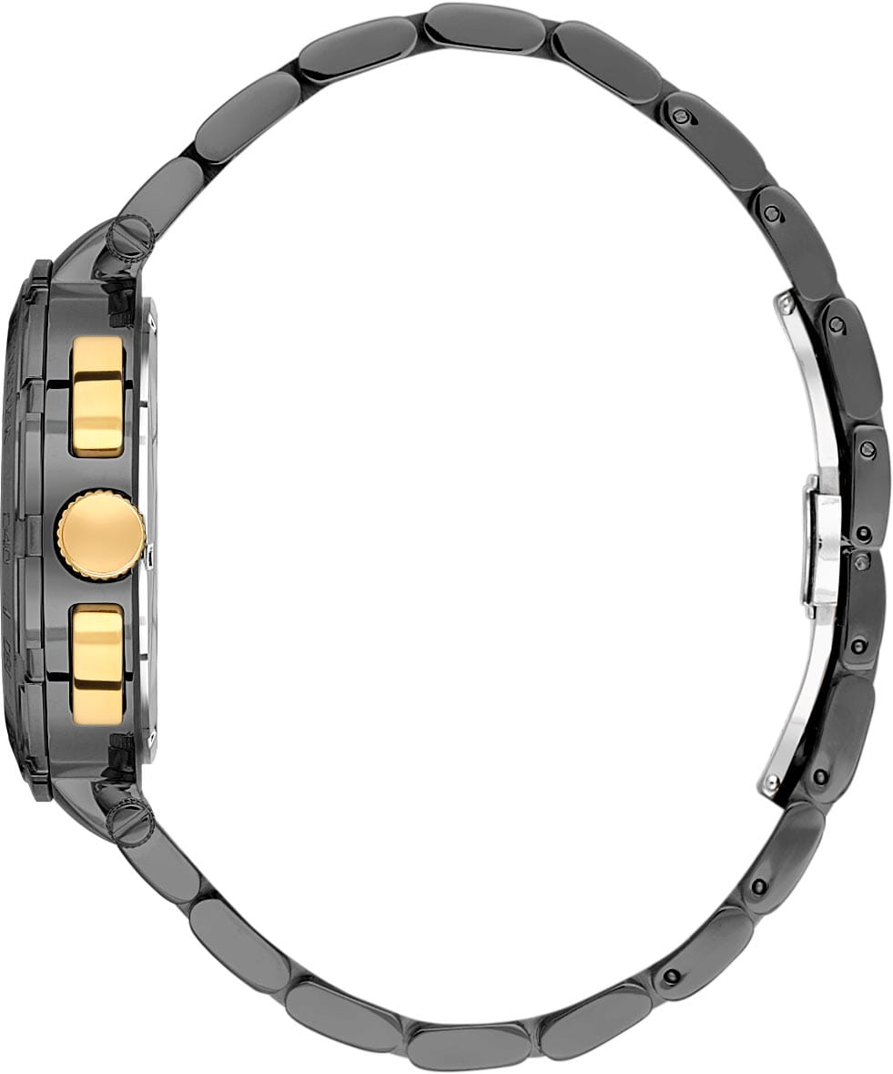 Циферблат подчёркивает индивидуальность модели и гармонично сочетается с серебристыми метками и стрелками. Функционал включает хронографХронографФункция позволяет измерять отрезки времени с особой точностью: часы, минуты, секунды. Верным признаком хронографа является наличие на циферблате 3 дополнительных окошек-счётчиков. с тремя субциферблатами, секундомерСекундомерСекундоме́р — прибор, способный измерять интервалы времени с точностью до долей секунды. и окошко даты, расположенное в области «4 часов». На фиксированном безелеБезельВнешний ободок, закрепляющий стекло. В спортивных часах так называется поворотное кольцо с делениями на циферблате, выполняет роль таймера – замеряет отрезки времени на шкале. Неподвижный безель – элемент декора. Однонаправленно вращающийся безель на дайверских часах позволяет фиксировать моменты погружения и выныривания на поверхность. размещена тахиметрическая шкала ТахиметрТахиметрРазмеченная шкала, располагается на ободке или безеле часов. Тахиметр позволяет рассчитать скорость на определённом участке пути, расстояние измеряется в километрах или милях., позволяющая измерять скорость.
