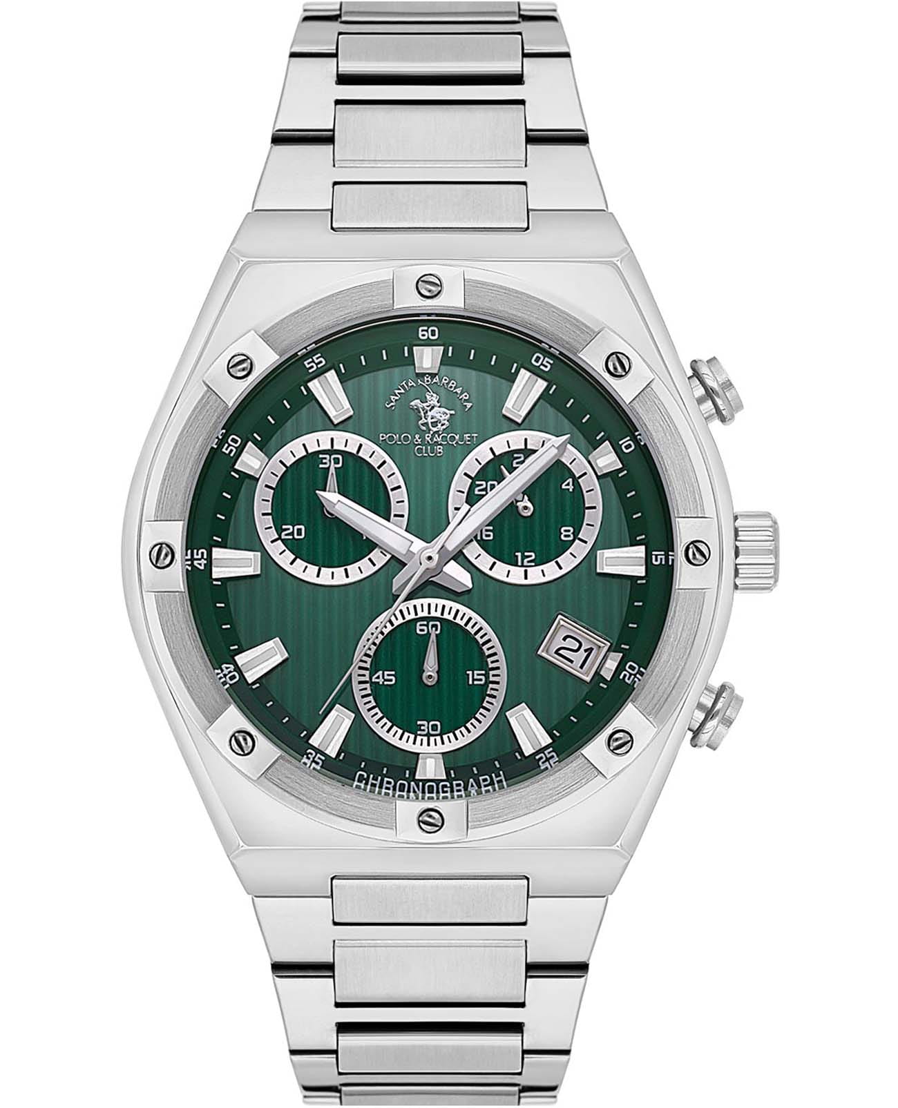 Santa Barbara Polo & Racquet Club Legend SB.1.10583-3 — стильные кварцевые мужские наручные часы-хронографХронографФункция позволяет измерять отрезки времени с особой точностью: часы, минуты, секунды. Верным признаком хронографа является наличие на циферблате 3 дополнительных окошек-счётчиков. с секундомеромСекундомерСекундоме́р — прибор, способный измерять интервалы времени с точностью до долей секунды., сочетающие спортивную динамику и функциональность. Крупный корпус выполнен из нержавеющей стали и гармонично дополнен стальным браслетом на раскладной застёжкеРаскладная застёжкаТакой тип застёжки используется только на браслетах из металла. Она никогда не раскрывается полностью, происходит разделение на 2 и более частей. Раскладывающая застёжка снизит вероятность потери часов к минимуму.. Циферблат с акцентными метками и стрелками с люминесцентным покрытиемЛюминесцентное покрытиеПозволяет считывать показания времени в темноте. Производители наносят на стрелки, часовые индексы, безель или поверхность циферблата светонакопительный состав, дающий холодное свечение. оформлен в многослойной структуре и оснащён вспомогательными индикаторами, включая 24-часовой формат времени. В нижней части расположено окошко даты, что делает модель ещё более практичной. Минеральное стеклоМинеральное стеклоМинеральное стекло представляет собой искусственно выращенный минерал кварца. Такое стекло отличается особой устойчивостью к повреждениям и царапинам. Уступает по некоторым качествам сапфировому стеклу. защищает циферблат от царапин, а кварцевый механизм обеспечивает высокую точность. Благодаря своей универсальной эстетике эти часы уместны и в деловой среде, и в повседневном образе.
