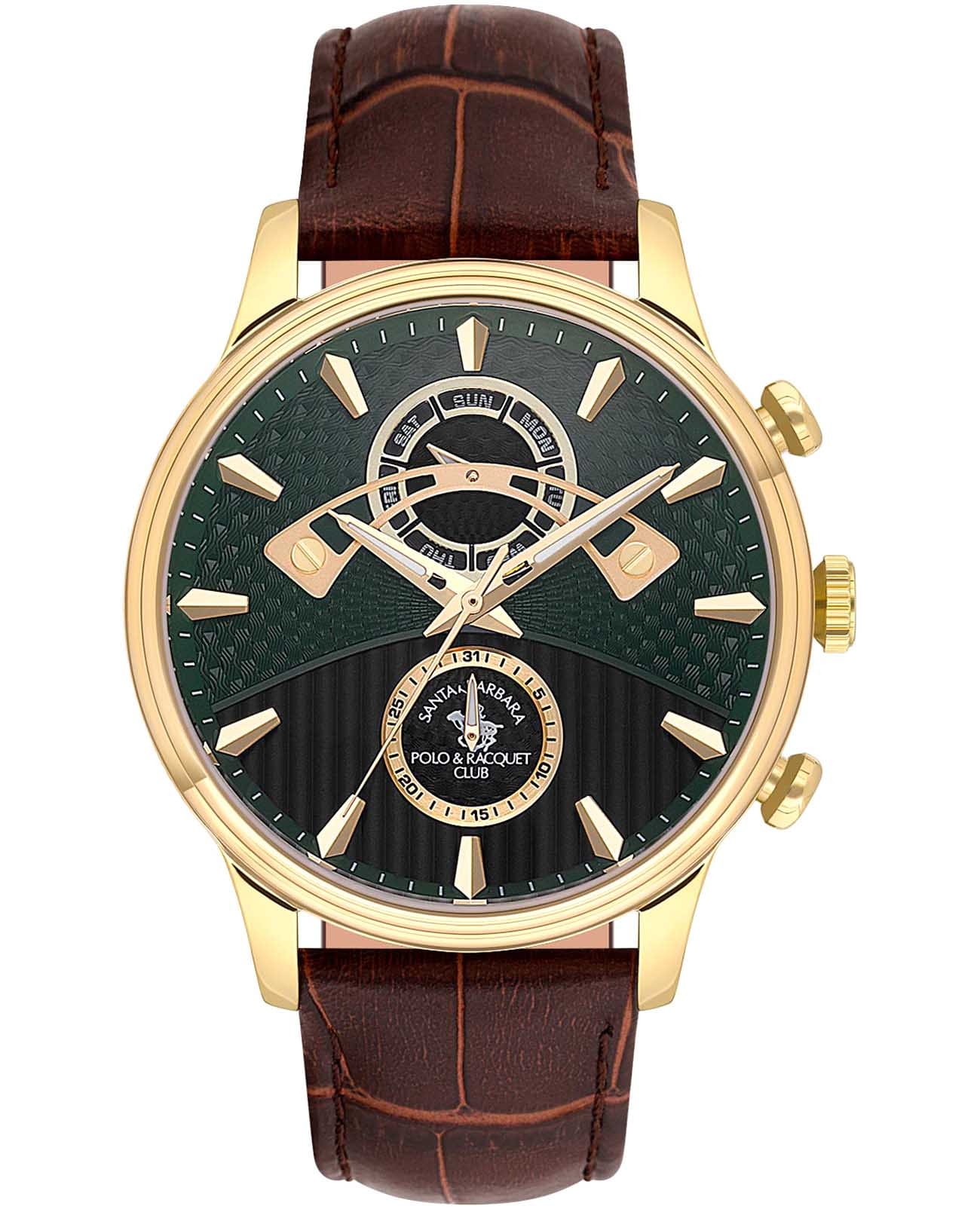 Мужские кварцевые часы Santa Barbara Polo & Racquet Club SB.1.10593-5 — воплощение элегантности и технического совершенства. Корпус из нержавеющей стали с IP-покрытиемIP-покрытиеМетод ионного напыления. Демонстрирует повышенную устойчивость к истиранию, окислению и химическим веществам. Под воздействием высокого давления и температуры около 1500°C молекулы металла надёжно соединяются с частицами корпуса часов. золотистого цвета, диаметром 45 мм, что делает их устойчивыми к внешним воздействиям и придает благородный вид. Стрелки с люминесцентным покрытиемЛюминесцентное покрытиеПозволяет считывать показания времени в темноте. Производители наносят на стрелки, часовые индексы, безель или поверхность циферблата светонакопительный состав, дающий холодное свечение., обеспечивающим хорошую читаемость в темноте. Циферблат защищён минеральным стекломМинеральное стеклоМинеральное стекло представляет собой искусственно выращенный минерал кварца. Такое стекло отличается особой устойчивостью к повреждениям и царапинам. Уступает по некоторым качествам сапфировому стеклу. устойчивое к царапинам и механическим повреждениям. Циферблат разделен на две фактурные части и украшен фирменным логотипом. Дата и день недели вынесены на отдельные циферблаты. Кожаный ремешок на застёжке-бабочке с кнопкамиЗастёжка "бабочка"Такой вид застёжки дополняется предохранителями, помогающими избежать случайного раскрытия браслета. Обладают изящным исполнением. обеспечивает комфортное и безопасное ношение. Водонепроницаемость 50 метров позволит защитить корпус от случайных брызг или капель дождя. Идеальный выбор для тех, кто ценит элегантный дизайн и качество.