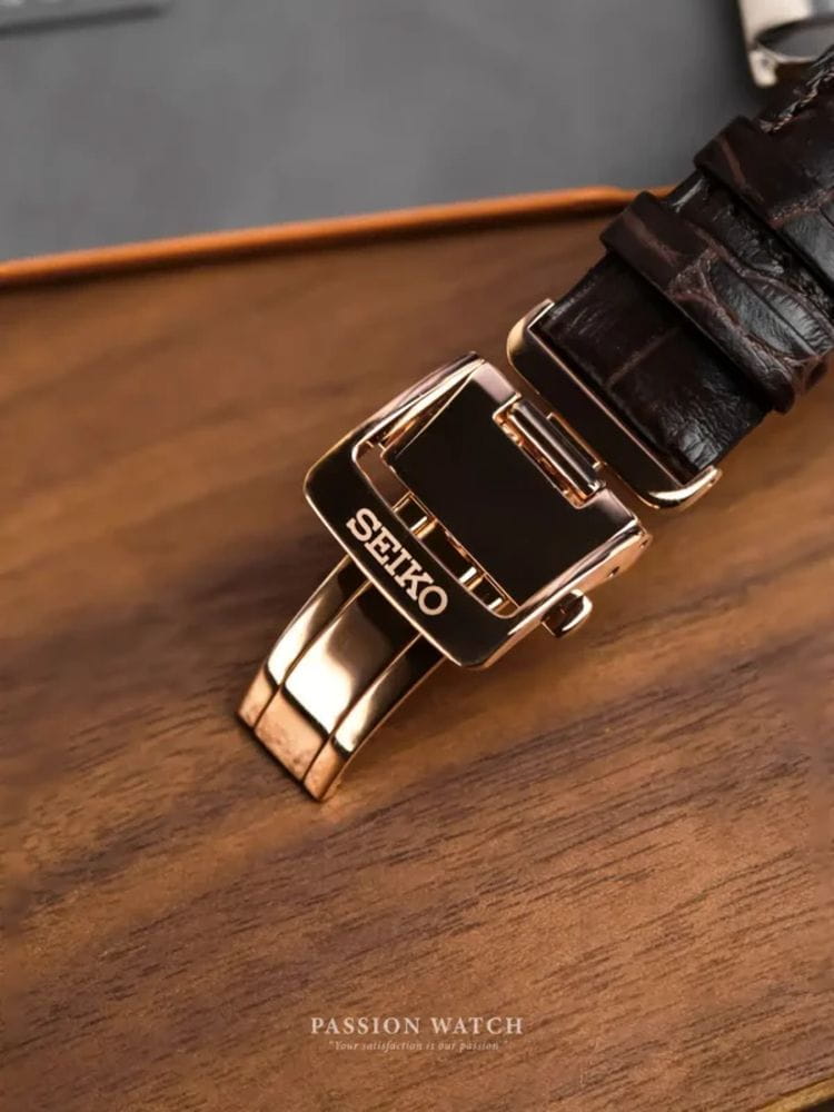 Модель Seiko SARY154 из коллекции Presage Japanese Garden — это элегантные автоматические часы, вдохновлённые эстетикой японских садов и философией дзен. Корпус диаметром 41,8 мм выполнен из нержавеющей стали и PVD-покрытиемPVDУльтратонкое покрытие наносится в технике вакуумного напыления, сочетает в себе нитрид титана особой прочности со слоем золота или оксида хрома. Несёт в себе декоративную или защитную функцию. с комбинированной полировкой и прозрачной задней крышкой. Водозащита составляет 30 метров — оптимально для повседневной носки. Фиксированный стальной безельБезельВнешний ободок, закрепляющий стекло. В спортивных часах так называется поворотное кольцо с делениями на циферблате, выполняет роль таймера – замеряет отрезки времени на шкале. Неподвижный безель – элемент декора. Однонаправленно вращающийся безель на дайверских часах позволяет фиксировать моменты погружения и выныривания на поверхность. подчёркивает гармоничные формы корпуса. Циферблат насыщенного цвета с тонкой текстурой напоминает волны гравия в японском саду. Открытое окно «open heart» на 9 часах позволяет наблюдать за работой механизма. В верхней части расположен индикатор запаса ходаШагомерШагоме́р или педо́метр — измерительный прибор для подсчёта количества сделанных шагов (или пар шагов) при ходьбе или беге.. Циферблат защищён двойным выпуклым сапфировым стекломСапфировое стеклоПрочный и надёжный материал из кристалла сапфира синтетического происхождения, характеризующийся особой твёрдостью и устойчивостью к царапинам и повреждениям. с внутренним антибликовым покрытиемАнтибликовое покрытиеСлой оксида металла в 0,13-0,3 микрон, благодаря которому стекло часов не бликует и не отражает свет. Антибликовое покрытие уменьшает отражение света в 10 раз, обеспечивая отличную читаемость показателей циферблата., устойчивым к царапинам и бликам. Внутри установлен автоматический калибр Seiko 4R39 с ручным подзаводом, функцией остановки секундной стрелки и запасом хода до 41 часа. Кожаный ремешок с раскладной застёжкойРаскладная застёжкаТакой тип застёжки используется только на браслетах из металла. Она никогда не раскрывается полностью, происходит разделение на 2 и более частей. Раскладывающая застёжка снизит вероятность потери часов к минимуму.. Seiko — это стильное и сбалансированное решение для ценителей классики с японским характером, где сочетаются глубокий дизайн и надёжная механика.