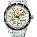 Мужские механические часы с автоподзаводом Seiko из коллекции Presage — это стильный аксессуар в ретро-дизайне. Корпус диаметром 39 мм и толщиной 12 мм выполнен из нержавеющей стали. БезельБезельВнешний ободок, закрепляющий стекло. В спортивных часах так называется поворотное кольцо с делениями на циферблате, выполняет роль таймера – замеряет отрезки времени на шкале. Неподвижный безель – элемент декора. Однонаправленно вращающийся безель на дайверских часах позволяет фиксировать моменты погружения и выныривания на поверхность. с IP-покрытиемIP-покрытиеМетод ионного напыления. Демонстрирует повышенную устойчивость к истиранию, окислению и химическим веществам. Под воздействием высокого давления и температуры около 1500°C молекулы металла надёжно соединяются с частицами корпуса часов.. Циферблат белого цвета с золотистыми элементами оформлен скелетонизированной структурой. Стрелки и метки с люминесцентным покрытиемЛюминесцентное покрытиеПозволяет считывать показания времени в темноте. Производители наносят на стрелки, часовые индексы, безель или поверхность циферблата светонакопительный состав, дающий холодное свечение., обеспечивающим хорошую читаемость в темноте. Циферблат защищён закалённым минеральным стеклом Hardlex, устойчивым к мелким повреждениям. Механизм — автоматический калибр 4R72 (24 камня, частота 21 600 полуколебаний в час) с запасом хода до 41 часа. Часы оснащены стальным браслетом на раскладной застёжкеРаскладная застёжкаТакой тип застёжки используется только на браслетах из металла. Она никогда не раскрывается полностью, происходит разделение на 2 и более частей. Раскладывающая застёжка снизит вероятность потери часов к минимуму.. Водонепроницаемость 50 м позволяет использовать часы в повседневных условиях. Идеальный выбор для тех, кто ценит японское качество и классический дизайн.