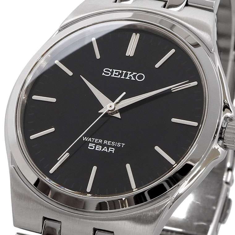 Мужские кварцевые часы Seiko — это надёжный и универсальный аксессуар. Корпус диаметром 36 мм выполнен из нержавеющей стали 316L. Циферблат чёрного цвета оформлен индексами и стрелками, включая центральную секундную стрелку. Циферблат защищён прочным закалённым минеральным стеклом Hardlex минеральным стекломМинеральное стеклоМинеральное стекло представляет собой искусственно выращенный минерал кварца. Такое стекло отличается особой устойчивостью к повреждениям и царапинам. Уступает по некоторым качествам сапфировому стеклу.. Механизм — кварцевый калибр 7N01 с высокой точностью хода (±10–15 сек. в месяц). Часы оснащены стальным браслетом на раскладной застёжкеРаскладная застёжкаТакой тип застёжки используется только на браслетах из металла. Она никогда не раскрывается полностью, происходит разделение на 2 и более частей. Раскладывающая застёжка снизит вероятность потери часов к минимуму. с фиксатором. Водонепроницаемость 50 м позволяет использовать часы в повседневных условиях. Идеальный выбор для тех, кто ценит японское качество и классический дизайн.