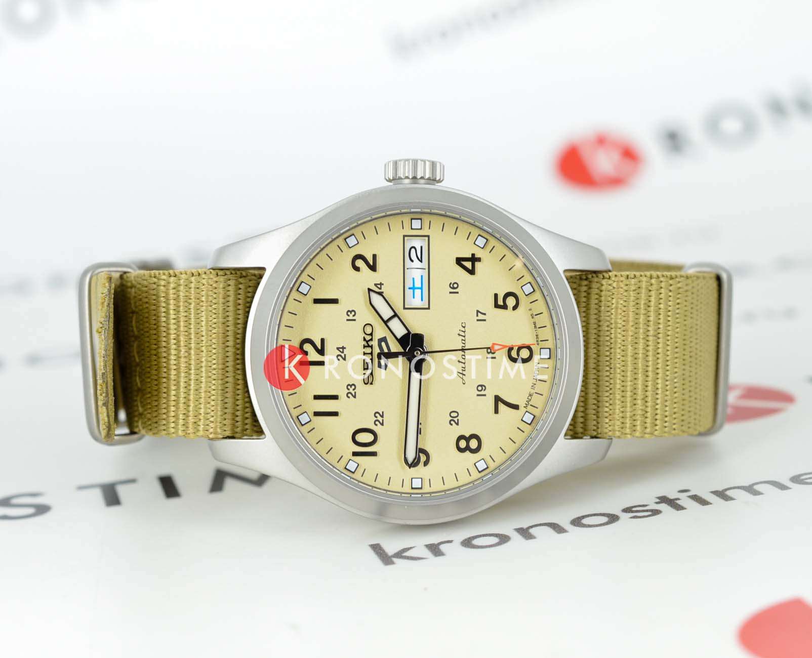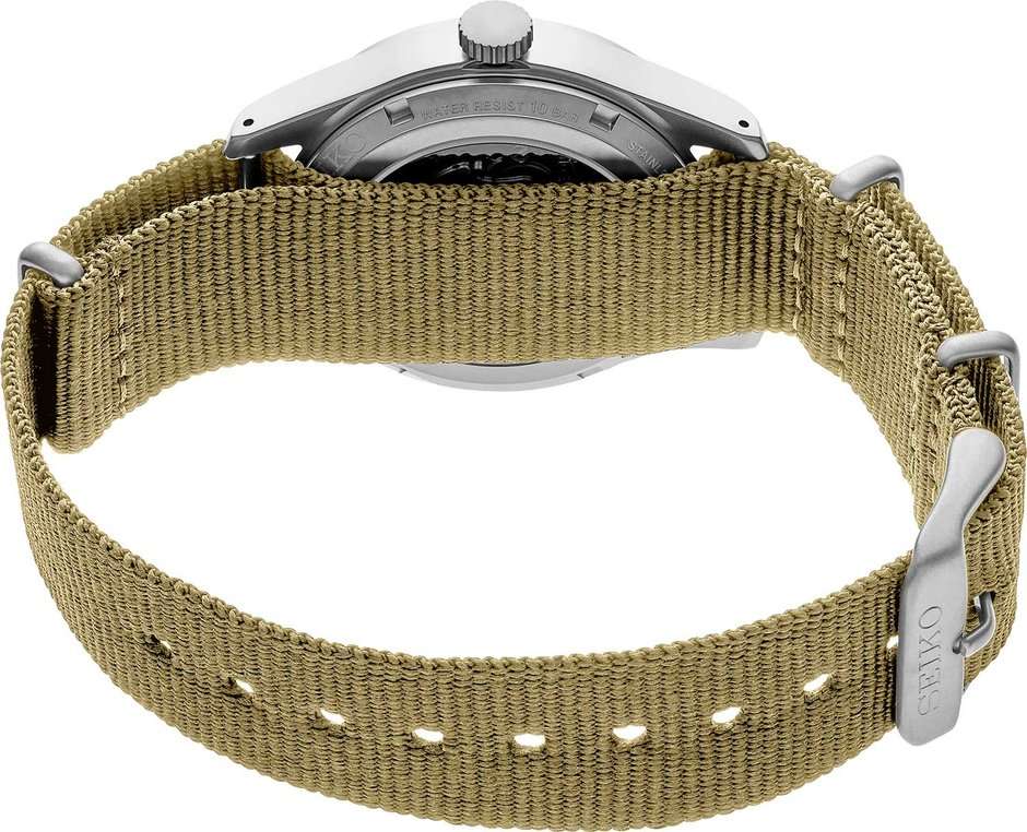 Модель Seiko SRPJ83K1 из серии Seiko 5 Sports Mid-Field — это компактные и надёжные автоматические часы в военном стиле с характерным «пустынным» оттенком. Корпус диаметром 36,4 мм выполнен из нержавеющей стали, оснащён прозрачной задней крышкой и обеспечивает водозащиту до 100 метров. Фиксированный стальной безельБезельВнешний ободок, закрепляющий стекло. В спортивных часах так называется поворотное кольцо с делениями на циферблате, выполняет роль таймера – замеряет отрезки времени на шкале. Неподвижный безель – элемент декора. Однонаправленно вращающийся безель на дайверских часах позволяет фиксировать моменты погружения и выныривания на поверхность. подчёркивает сдержанный и утилитарный дизайн модели. Песочный циферблат оформлен с акцентом на читаемость: крупная 12/24-часовая шкала, контрастные стрелки и метки с люминесцентным покрытиемЛюминесцентное покрытиеПозволяет считывать показания времени в темноте. Производители наносят на стрелки, часовые индексы, безель или поверхность циферблата светонакопительный состав, дающий холодное свечение. LumiBrite. На позиции «3 часа» расположены индикаторы даты и дня недели. Циферблат защищён прочным минеральным стекломМинеральное стеклоМинеральное стекло представляет собой искусственно выращенный минерал кварца. Такое стекло отличается особой устойчивостью к повреждениям и царапинам. Уступает по некоторым качествам сапфировому стеклу. Hardlex с куполообразной формой. Внутри установлен автоматический механизм Seiko 4R36 с функцией ручного подзавода, остановкой секундной стрелки, запасом хода до 41 часа и двойной календарной индикацией. Модель комплектуется текстильным ремешком NATOРемешок NATOРемешок NATO — это прочный, универсальный и сменный часовой ремешок, изначально созданный для военных. Он изготовлен из нейлона или другого прочного материала и имеет уникальную конструкцию, которая позволяет часам оставаться на запястье даже в случае поломки одной из прикрепляющих точек. песочного цвета шириной 18 мм — удобным, лёгким и устойчивым к износу. Seiko SRPJ83K1 — это универсальные полевые часы с характером и компактным корпусом, сочетающие практичность, военную строгость и надёжную механику.