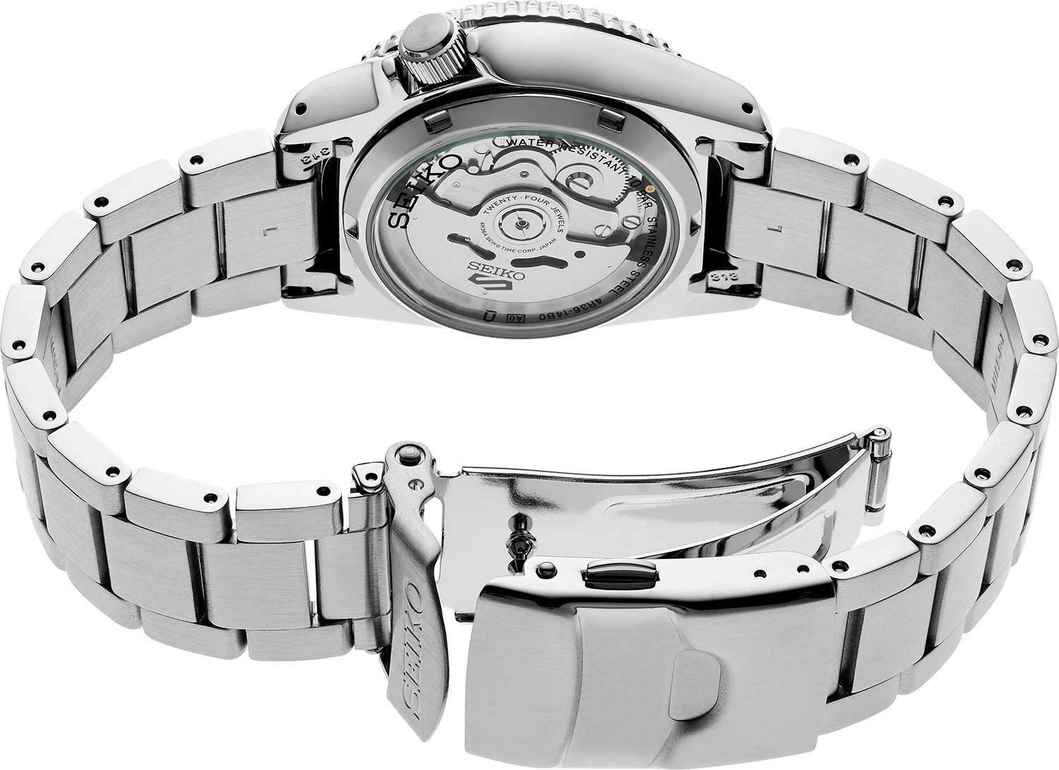 Мужские японские часы с запасом хода 41 час Seiko 5 Sports SRPK35K1 с минеральным стекломМинеральное стеклоМинеральное стекло представляет собой искусственно выращенный минерал кварца. Такое стекло отличается особой устойчивостью к повреждениям и царапинам. Уступает по некоторым качествам сапфировому стеклу. повышенной прочности Hardlex, механический механизм (автоматический калибр) с высокой точностью. Класс водозащиты: 100 метров, позволит плавать, нырять и заниматься другими водными видами спорта. БезельБезельВнешний ободок, закрепляющий стекло. В спортивных часах так называется поворотное кольцо с делениями на циферблате, выполняет роль таймера – замеряет отрезки времени на шкале. Неподвижный безель – элемент декора. Однонаправленно вращающийся безель на дайверских часах позволяет фиксировать моменты погружения и выныривания на поверхность. с частичным PVD-покрытиемPVDУльтратонкое покрытие наносится в технике вакуумного напыления, сочетает в себе нитрид титана особой прочности со слоем золота или оксида хрома. Несёт в себе декоративную или защитную функцию. вращается в одном направлении. Корпус часов изготовлен из стали. Стальной браслет на раскладной застёжкеРаскладная застёжкаТакой тип застёжки используется только на браслетах из металла. Она никогда не раскрывается полностью, происходит разделение на 2 и более частей. Раскладывающая застёжка снизит вероятность потери часов к минимуму.. Стрелки и метки с люминесцентным покрытиемЛюминесцентное покрытиеПозволяет считывать показания времени в темноте. Производители наносят на стрелки, часовые индексы, безель или поверхность циферблата светонакопительный состав, дающий холодное свечение. LumiBrite.Окошко даты находится в положении 3 часа. Заводная коронка находится на «4 часах».