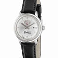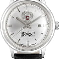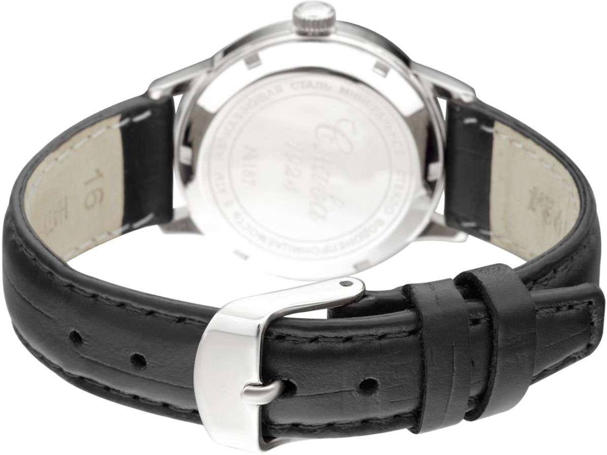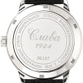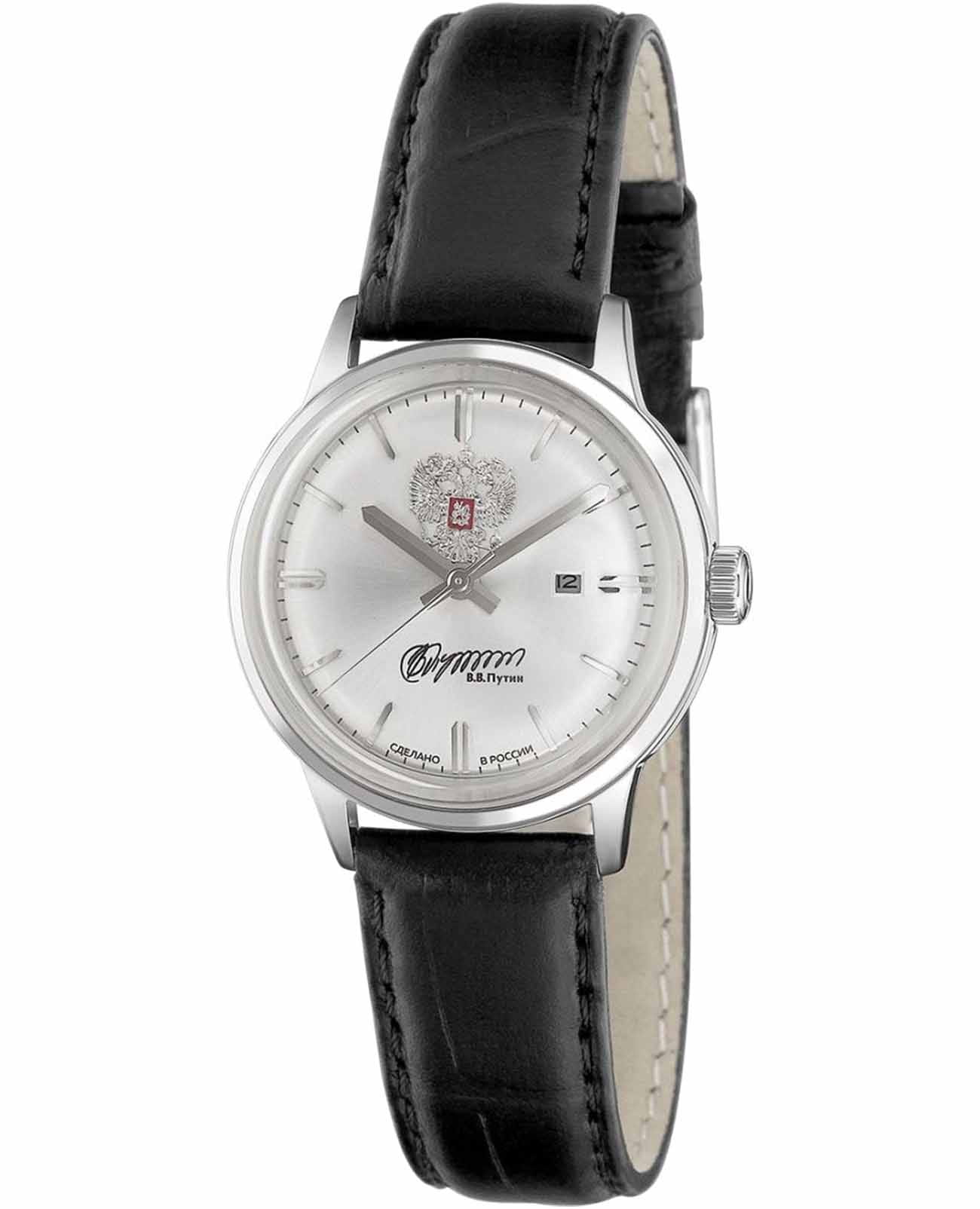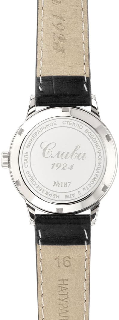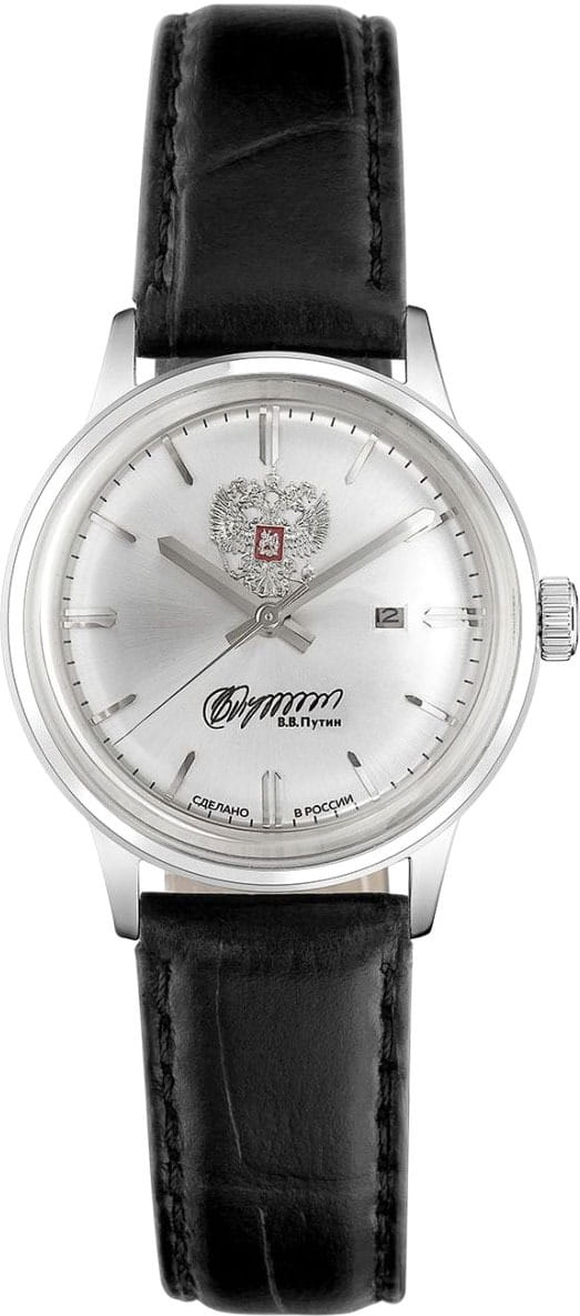 Российские механические наручные часы Слава 1870090/300-6T15 станут стильным и надежным аксессуаром для вашего образа. Эти элегантные часы созданы с акцентом на высокое качество и изысканный дизайн. Оборудованные механизмом Miyota 6T15 с автоподзаводом, они обеспечивают точность и надежность, поддерживая запас хода до 40 часов. Часы заключены в прочный стальной корпус диаметром 32 мм с минеральным стекломМинеральное стеклоМинеральное стекло представляет собой искусственно выращенный минерал кварца. Такое стекло отличается особой устойчивостью к повреждениям и царапинам. Уступает по некоторым качествам сапфировому стеклу., что обеспечивает надежную защиту и долговечность. Серебристый циферблат, выполненный по технологии Sunray, украшен изображением герба Российской Федерации и автографом В.В. Путина. Широкие заостренные стрелки в стиле Baton и штриховые метки придают циферблату выразительность и читаемость. Часы оснащены календарем с окошком даты на 3 часах, что делает их еще более функциональными. Рифленая заводная головка и завинчивающаяся задняя крышка добавляют изделию надежности и комфорта в использовании. Завершает образ текстурированный кожаный ремешок черного цвета с классической застежкой, который обеспечивает удобную посадку на запястье. Благодаря водозащите до 50WR, эти часы подойдут для повседневного использования, сохраняя свой безупречный вид и функциональность.