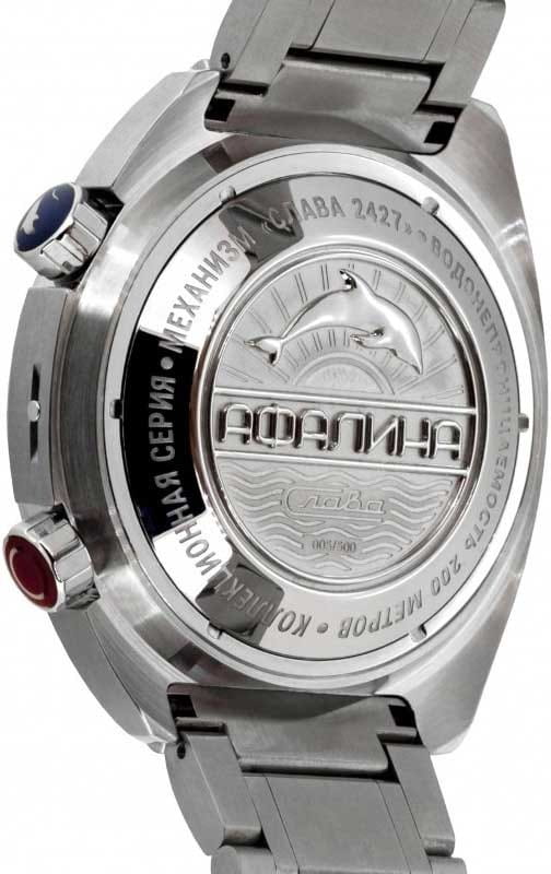 Коллекционные часы Слава Афалина 2430518/100-2427 — это превосходный выбор для тех, кто ценит стиль и функциональность. Модель из лимитированной серии, состоящей всего из 500 экземпляров, отличается прочным стальным корпусом и предназначена для любителей дайвинга. Часы оснащены надежным механическим механизмом с автоподзаводом и водозащитой до 200 метров, что делает их идеальными для подводных приключений. Синий циферблат дополняется стрелками с люминесцентным покрытиемЛюминесцентное покрытиеПозволяет считывать показания времени в темноте. Производители наносят на стрелки, часовые индексы, безель или поверхность циферблата светонакопительный состав, дающий холодное свечение. для отличной видимости в условиях низкой освещенности, а сапфировое стеклоСапфировое стеклоПрочный и надёжный материал из кристалла сапфира синтетического происхождения, характеризующийся особой твёрдостью и устойчивостью к царапинам и повреждениям. с антибликовым покрытиемАнтибликовое покрытиеСлой оксида металла в 0,13-0,3 микрон, благодаря которому стекло часов не бликует и не отражает свет. Антибликовое покрытие уменьшает отражение света в 10 раз, обеспечивая отличную читаемость показателей циферблата. защищает от царапин и бликов. Основная заводная головка расположена на корпусе ближе к отметке ''4 часа'', она позволяет настраивать время и заводить часы перед погружением. С помощью второй головки, расположенной у отметки ''2 часа'', можно управлять вращающимся внутренним кольцом безеляБезельВнешний ободок, закрепляющий стекло. В спортивных часах так называется поворотное кольцо с делениями на циферблате, выполняет роль таймера – замеряет отрезки времени на шкале. Неподвижный безель – элемент декора. Однонаправленно вращающийся безель на дайверских часах позволяет фиксировать моменты погружения и выныривания на поверхность. с PVDPVDУльтратонкое покрытие наносится в технике вакуумного напыления, сочетает в себе нитрид титана особой прочности со слоем золота или оксида хрома. Несёт в себе декоративную или защитную функцию. покрытием синего цвета и фиксировать его в нужном положении. Окошко даты и дня недели удобно расположено на отметке "3 часа", а профессиональная "дайвинг-застежка" стального браслета имеет удлинение для гидрокостюма. Особая забота о природе: часть средств от продажи данной модели перечисляется в центр спасения дельфинов "Дельфа". Часы серии "Афалина" — это не только функциональный аксессуар, но и символ вашей поддержки благородного дела.