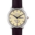 Российские механические часы с автоподзаводом Слава Революция 2600270/300-2427 созданы для тех, кто ценит стиль и надежность. Эта модель является плодом сотрудничества Часовой компании «Слава» и знаменитого мастера Александра Шорохова, который известен своим вкладом в возрождение российского часового мастерства и продвижение культуры в мире. Эти часы выполнены в соответствии с эскизами мастера, с использованием революционных символов — серпа и молота. Часы Слава «Революция» обладают механизмом с автоподзаводом «Слава 2427», украшенным ручной гравировкой, который можно наблюдать через прозрачную заднюю крышку. Этот механизм обеспечивает надежность и точность, а также добавляет элемент эксклюзивности. Корпус часов выполнен из стали и имеет серебристый оттенок, который гармонично сочетается с бежевым циферблатом. Диаметр корпуса составляет 44 мм, а толщина — 14,5 мм, что делает часы выразительными и комфортными для носки.  Сапфировое стеклоСапфировое стеклоПрочный и надёжный материал из кристалла сапфира синтетического происхождения, характеризующийся особой твёрдостью и устойчивостью к царапинам и повреждениям. защищает циферблат от царапин и обеспечивает долгий срок службы. Часы оснащены функцией двойного календаря, который отображает дату, что добавляет практичности в повседневной носке. Натуральный кожаный ремешок с застежкой «бабочка»Застёжка "бабочка"Такой вид застёжки дополняется предохранителями, помогающими избежать случайного раскрытия браслета. Обладают изящным исполнением. завершают образ, обеспечивая удобство и стиль. С водонепроницаемостью до 100 метров эти часы подходят для активного образа жизни, позволяя не беспокоиться о случайных контактах с водой, таких как плавание или дождь. Слава «Революция» выпускаются ограниченной серией — в трех видах по 100 штук.
