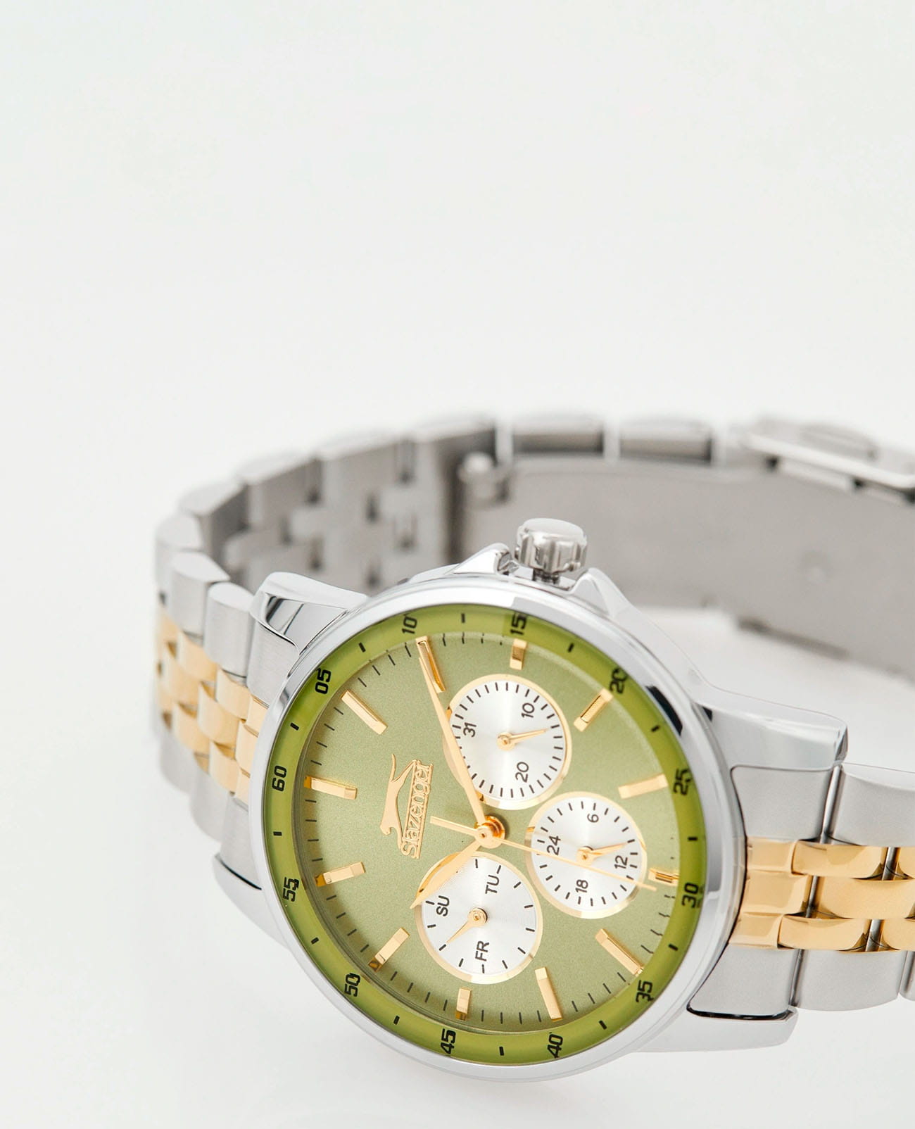 Женские наручные часы Slazenger SL.09.2009.4.09 представляют собой элегантное сочетание классического дизайна и функциональности современных технологий. Модель обладает круглым корпусом диаметром 36 мм, изготовленным из металлического сплава с IP-покрытиемIP-покрытиеМетод ионного напыления. Демонстрирует повышенную устойчивость к истиранию, окислению и химическим веществам. Под воздействием высокого давления и температуры около 1500°C молекулы металла надёжно соединяются с частицами корпуса часов., что обеспечивает высокую устойчивость к внешним воздействиям и привлекательный внешний вид. Интегрированный браслет на 5 звеньев с раскладной замокРаскладной замокДанный вариант застежки используется только на часах с металлическим браслетом. Отличительная особенность такого крепления в том, что длина браслета становится универсальной и вы можете самостоятельно отрегулировать нужный вам размер – застежка просто двигается по браслету часов. гарантирует комфортное ношение и безопасность . Зеленый циферблат дополнен тремя малыми циферблатами для отображения даты, дня недели и времени в формате 24 часа, а также защищен прочным минеральным стекломМинеральное стеклоМинеральное стекло представляет собой искусственно выращенный минерал кварца. Такое стекло отличается особой устойчивостью к повреждениям и царапинам. Уступает по некоторым качествам сапфировому стеклу.. Часы работают на кварцевом механизме, обеспечивающем точное время без необходимости подзаводки. Водонепроницаемость достигает 3 атмосфер (WR30), что позволяет использовать их в повседневной жизни, но не рекомендуется для плавания или водных видов спорта.