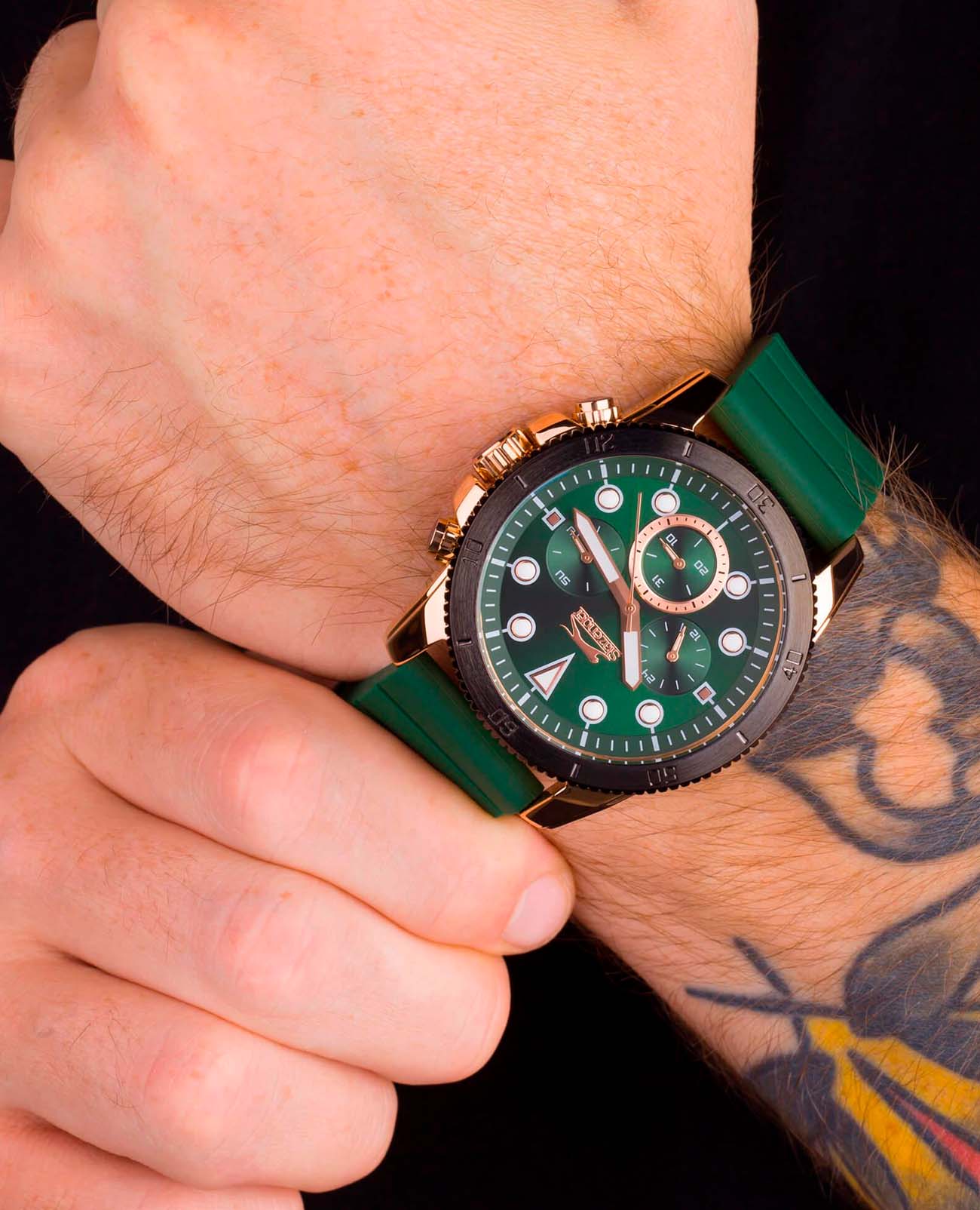 Мужские наручные часы Slazenger SL.09.2012.2.05 сочетают в себе спортивный дизайн и функциональность современных технологий. Модель обладает круглым корпусом диаметром 47 мм, изготовленным из суперметалла с IP-покрытиемIP-покрытиеМетод ионного напыления. Демонстрирует повышенную устойчивость к истиранию, окислению и химическим веществам. Под воздействием высокого давления и температуры около 1500°C молекулы металла надёжно соединяются с частицами корпуса часов., что обеспечивает высокую устойчивость к внешним воздействиям. Браслет выполнен из зеленого полимерного материала, а застежка стандартная, гарантирующая комфортное ношение и безопасность. БезельБезельВнешний ободок, закрепляющий стекло. В спортивных часах так называется поворотное кольцо с делениями на циферблате, выполняет роль таймера – замеряет отрезки времени на шкале. Неподвижный безель – элемент декора. Однонаправленно вращающийся безель на дайверских часах позволяет фиксировать моменты погружения и выныривания на поверхность. с IP-покрытиемIP-покрытиеМетод ионного напыления. Демонстрирует повышенную устойчивость к истиранию, окислению и химическим веществам. Под воздействием высокого давления и температуры около 1500°C молекулы металла надёжно соединяются с частицами корпуса часов.. Зеленый циферблат дополнен индексами и тремя малыми циферблатами для отображения различных функций, а также защищен прочным минеральным стекломМинеральное стеклоМинеральное стекло представляет собой искусственно выращенный минерал кварца. Такое стекло отличается особой устойчивостью к повреждениям и царапинам. Уступает по некоторым качествам сапфировому стеклу. с люминесцентным покрытиемЛюминесцентное покрытиеПозволяет считывать показания времени в темноте. Производители наносят на стрелки, часовые индексы, безель или поверхность циферблата светонакопительный состав, дающий холодное свечение. для лучшей видимости в темноте. Часы работают на кварцевом механизме, что гарантирует точное время без необходимости подзаводки. Водонепроницаемость часов достигает уровня 5 атмосфер (WR50), что позволяет использовать их во время плавания, однако не рекомендуется для глубоководного дайвинга.